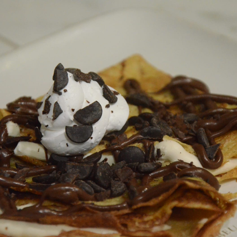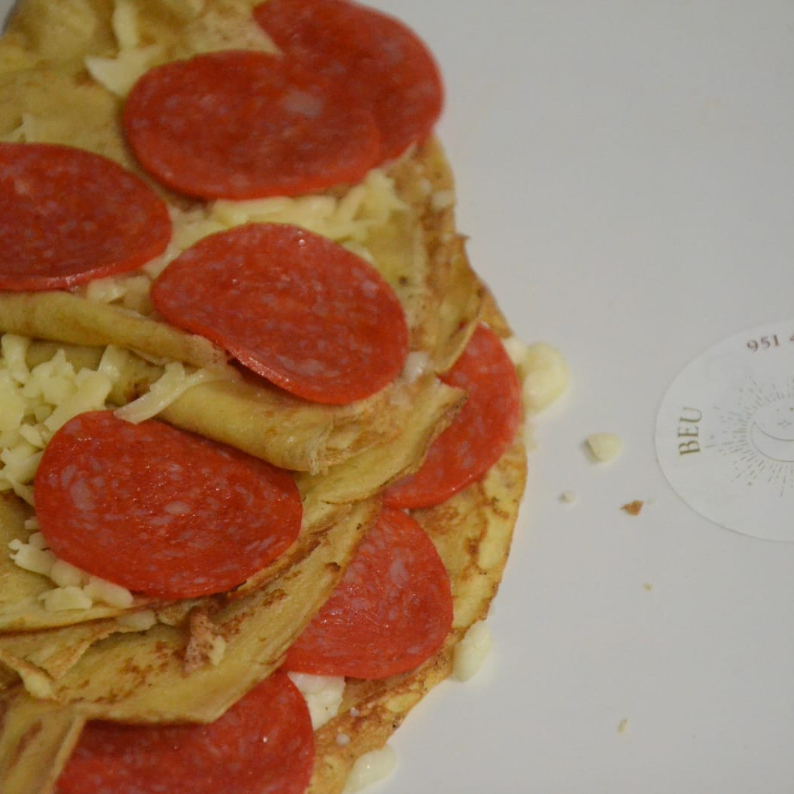 Crepa de pepperoni con queso gouda, acompañado de un aderezo de chipotle