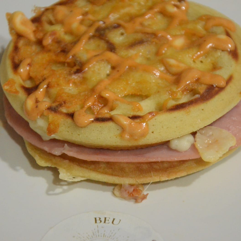 sandwich con pan de waffle, relleno de jamon y queso, acompañado con aderezo de chipotle.