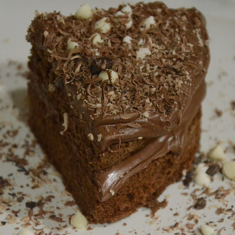 Rebanada de pastel de bizcocho de chocolate y ganache de chocolate.