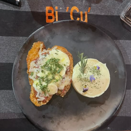 Pechuga empanizada con salsa de tomate, queso mozzarella fresco, albahaca y puré de papa.