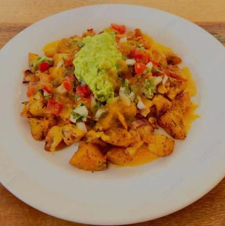 Papas con tocino crujiente, queso cheddar, aguacate, salsa picante de molcajete, pico de gallo y crema.