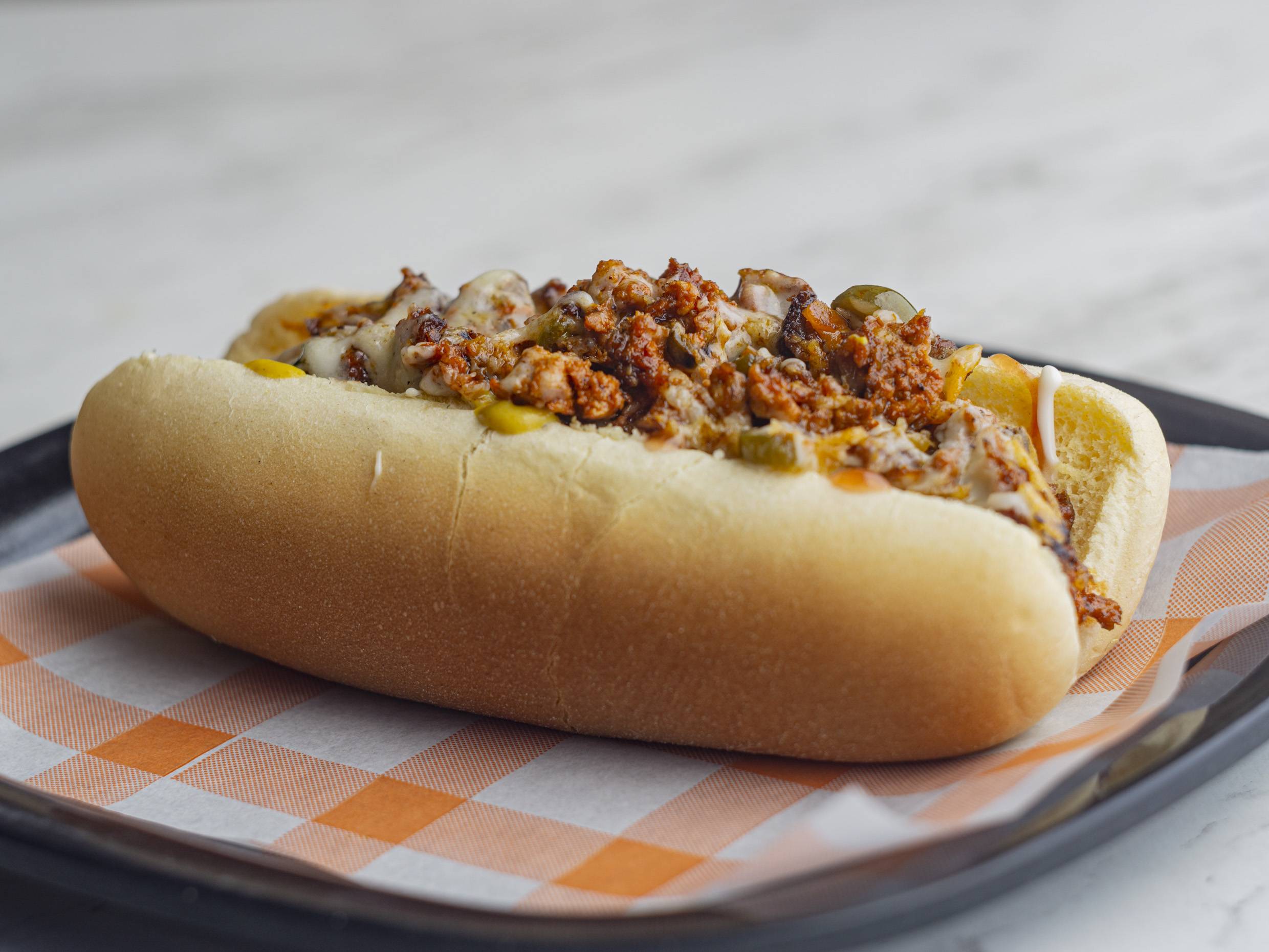 Salchicha de pavo, tocino, tomate, cebolla y chiles en vinagre.
