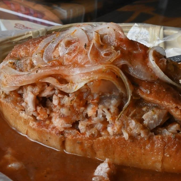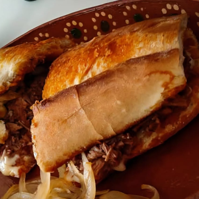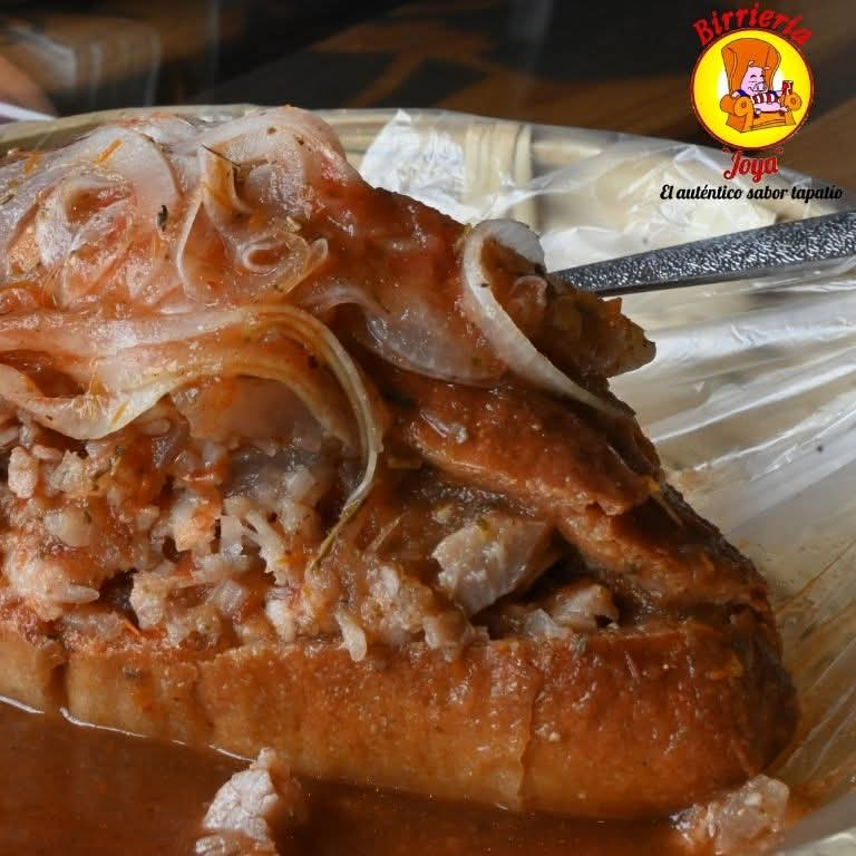 Autentico pan birote relleno de Camarones o Birria, con sus famosas salsas y cebollas encurtidas