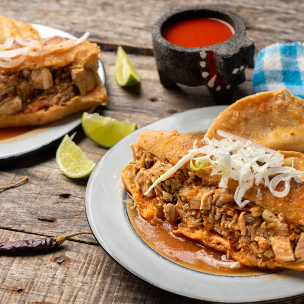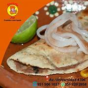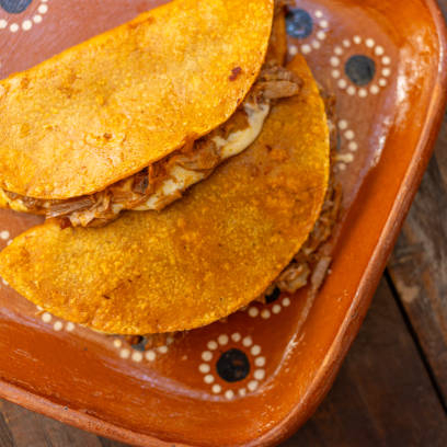 surtida de cerdo y queso manchego en tortilla de maíz acompañado de cebollitas encurtidas, salsa picante