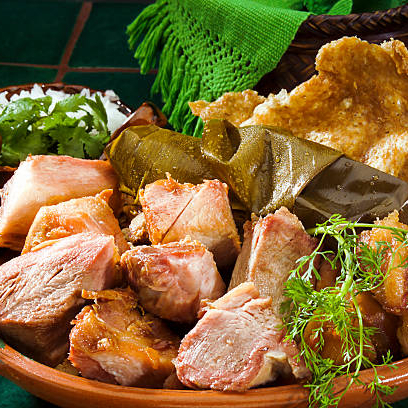 Carnitas estilo Jalisco, tortilla de maíz, frijoles tapatios, cebollitas encurtidas, salsa picante y guacamole