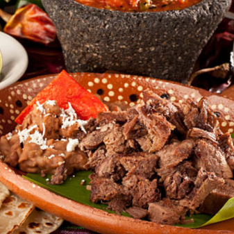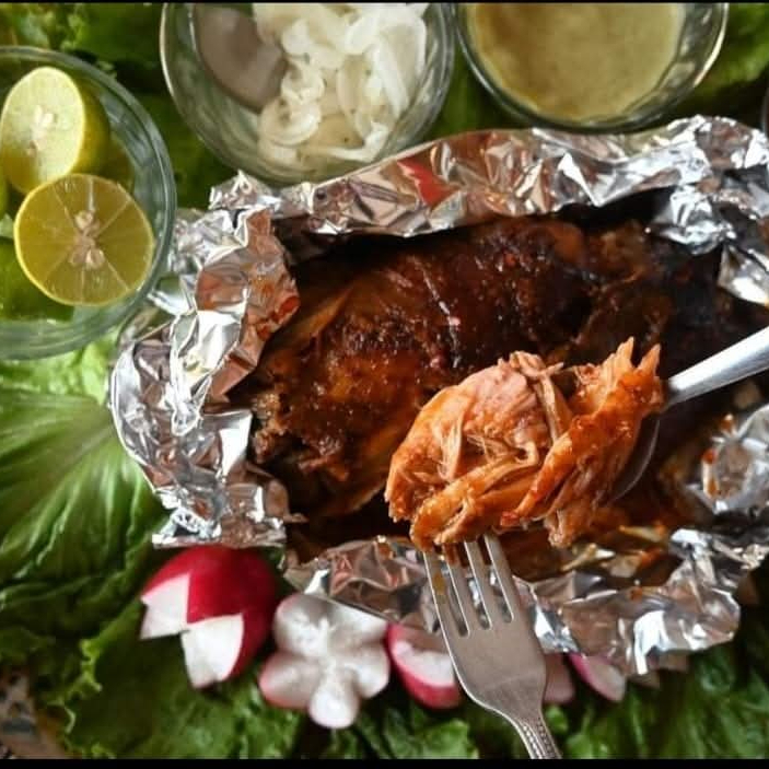 Adobado, cocido en horno de barro, 500 gramos acompañado de frijoles tapatios, guacamole, salsa, cebollas encurtidas, 3 tacos dorados