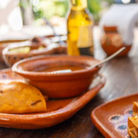 Enchilada, horneada en olla de barro, 300 gramos acompañado de frijoles tapatios, guacamole, salsa, cebollas encurtidas, tortillas
