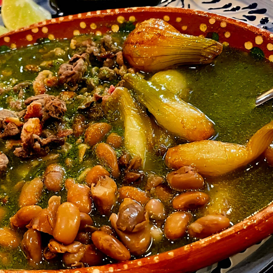 Bistec de res cortado finamente guisado con tocino frito, frijoles bayos y cebollitas