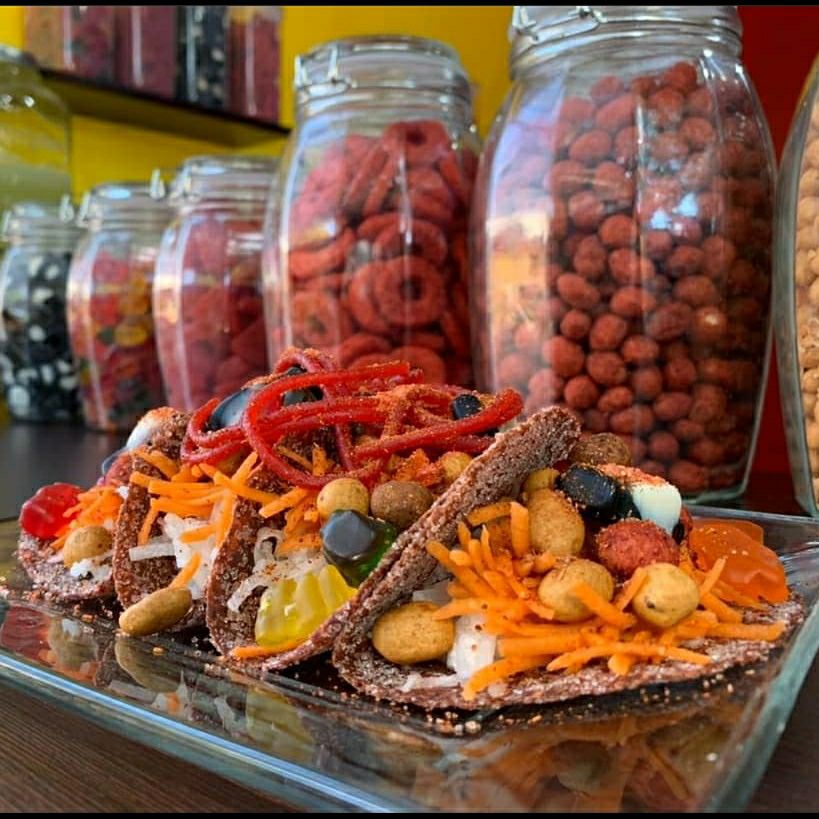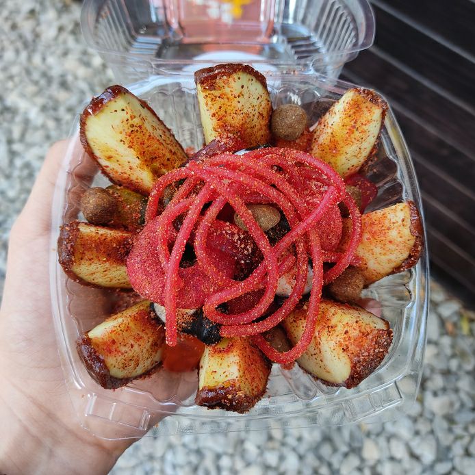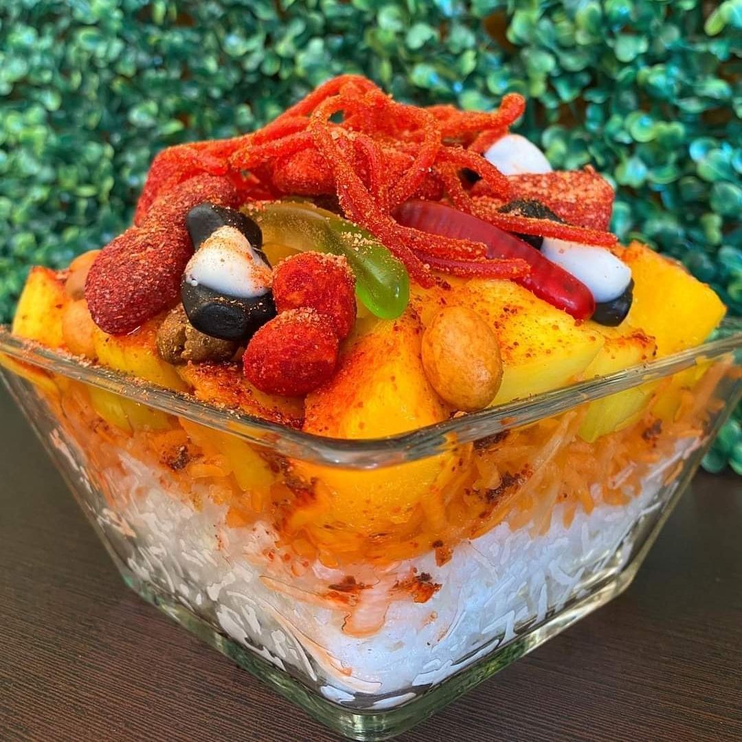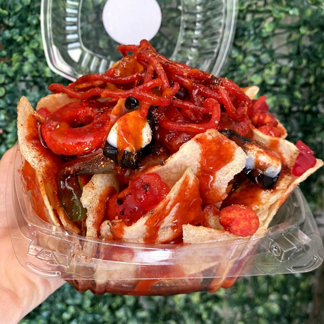 Manzana forrada de Tajín, papas chips fuego, cacahuates japoneses, Hot Nuts, variedad de gomitas, Miguelito, Tajín, limón, salsa Botanera y chamoy.