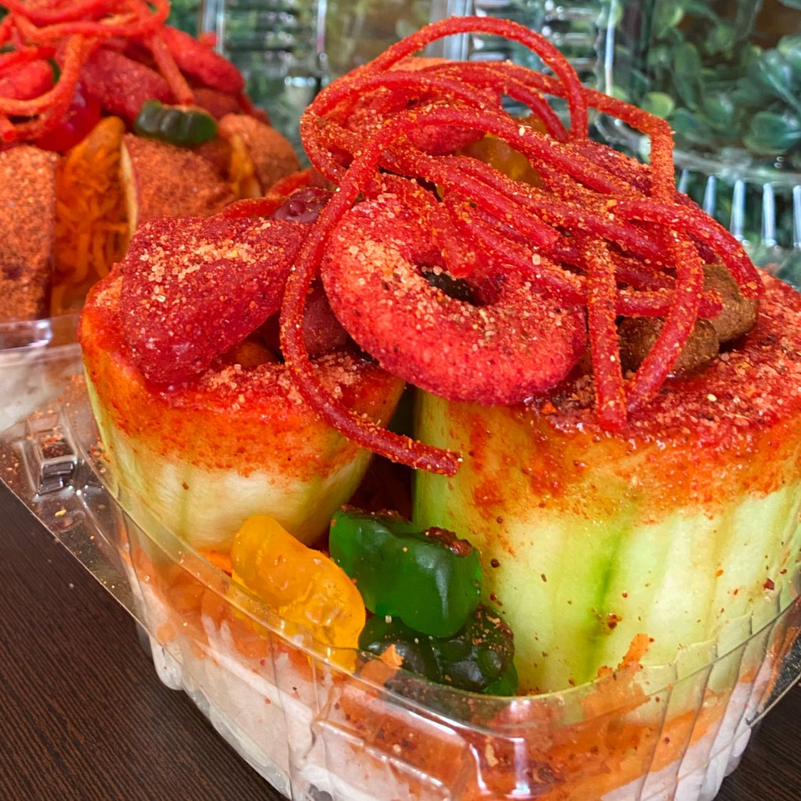 Pepino forrado de tamarindo con cacahuetes japoneses, hot nuts, variedad de gomitas y skwinkles