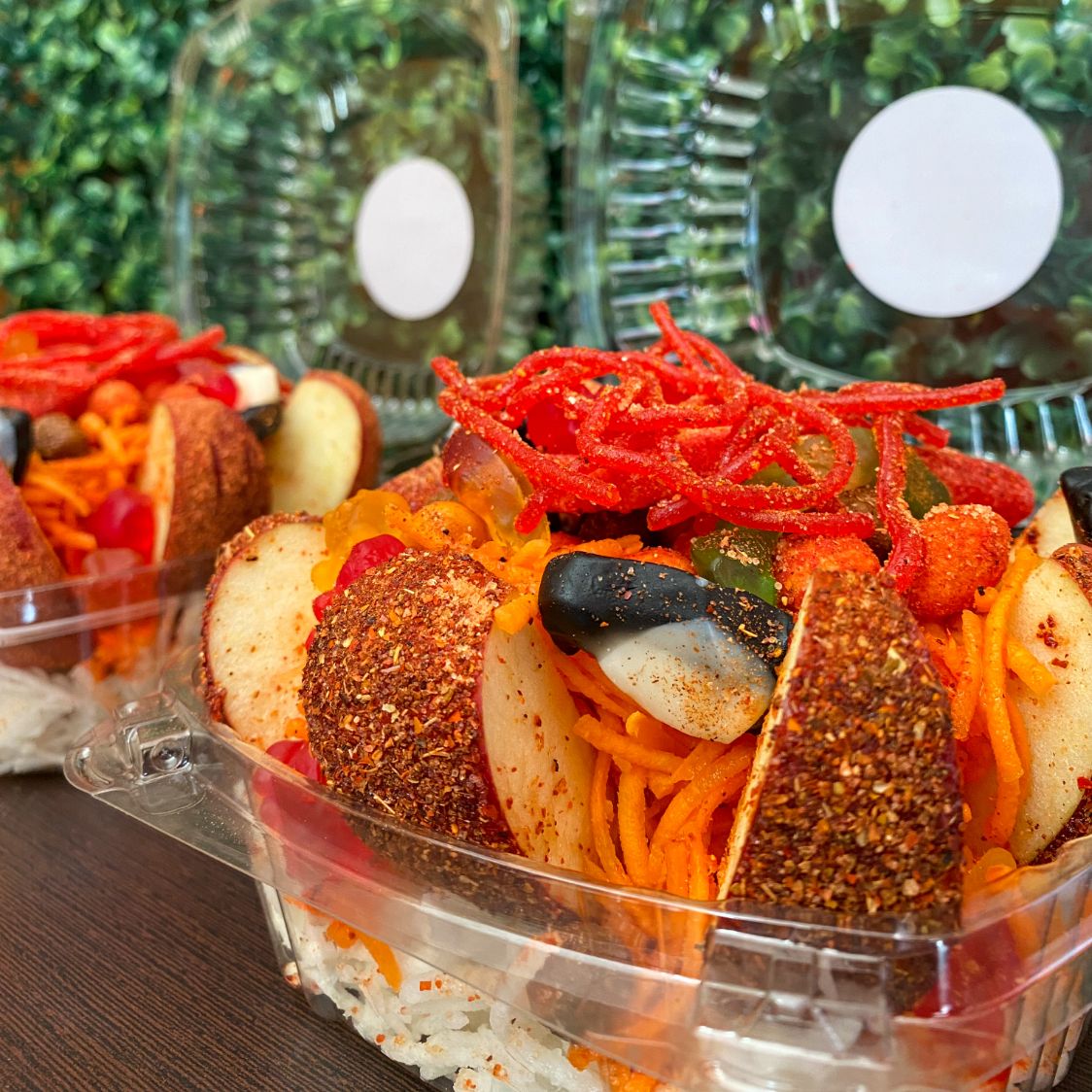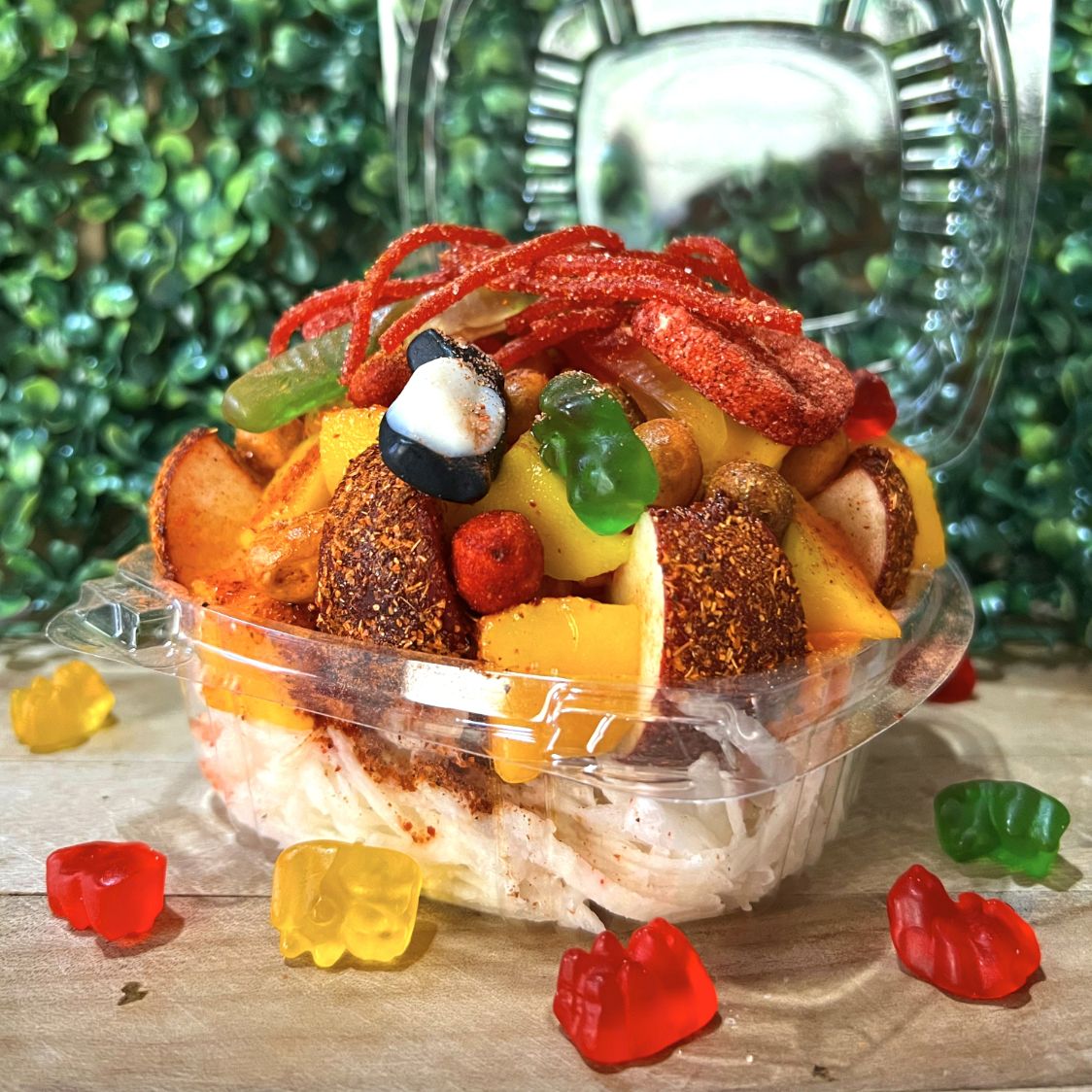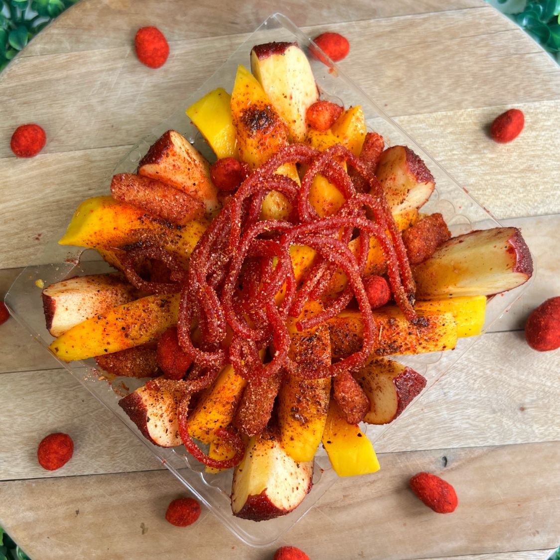 Manzana forrada de tajin, pepino picado, cacahuetes hot nuts, gomitas enchiladas, skwinkles, miguelito, tajin, chamoy y salsa especial