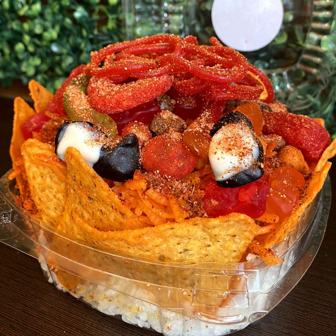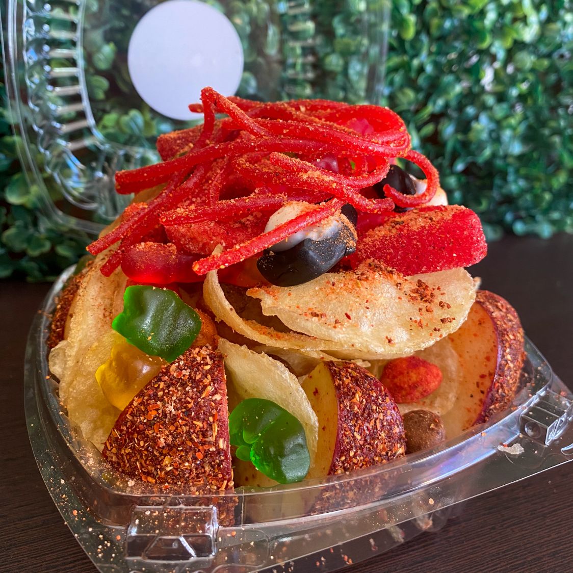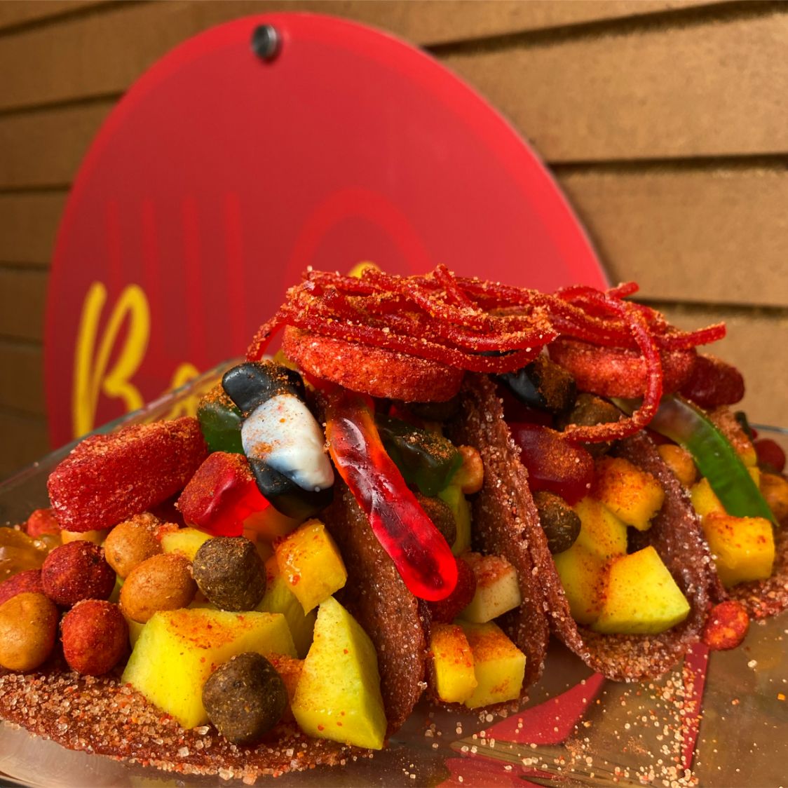 Domo grande, con una base de jícama y zanahoria rallada, Doritos Nacho, cacahuates japoneses, Hot Nuts, 5 variedades de gomitas, Skwinkles, Tajín, Miguelito, salsa Botanera y chamoy.