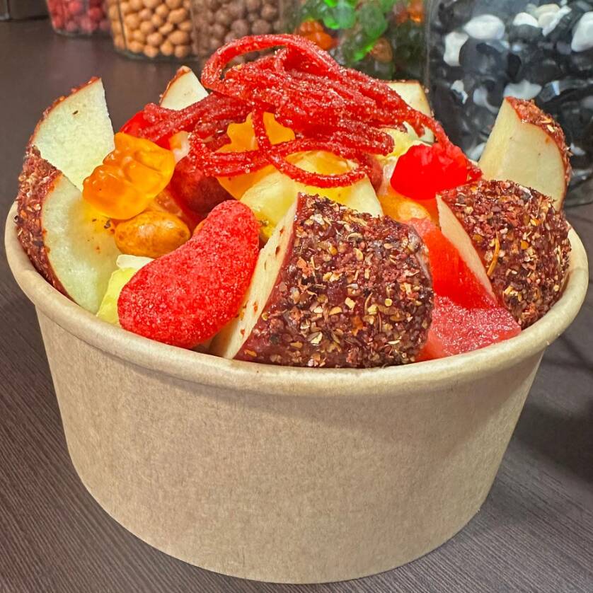 Manzana forrada con cacahuates japoneses, Hot Nuts, 5 variedades de gomitas, Skwinkles, Tajín, Miguelito y salsa Botanera.