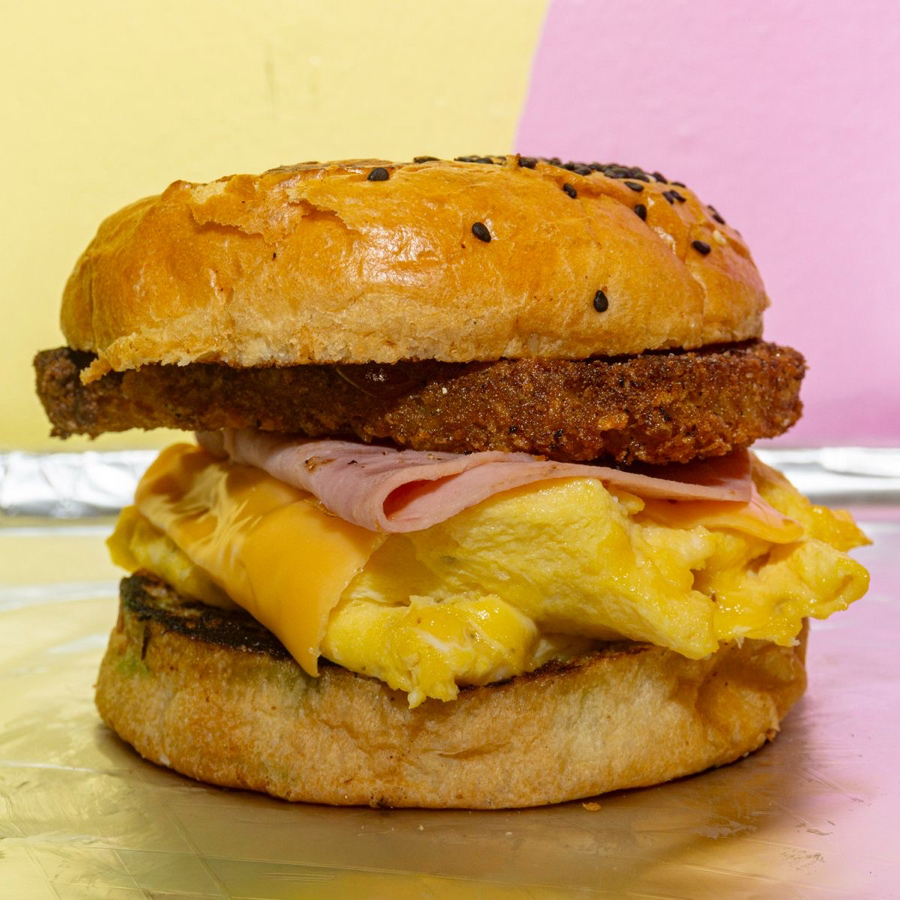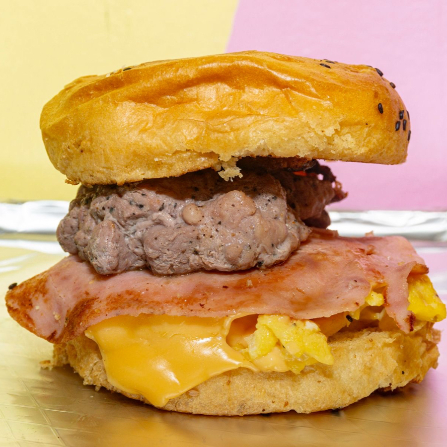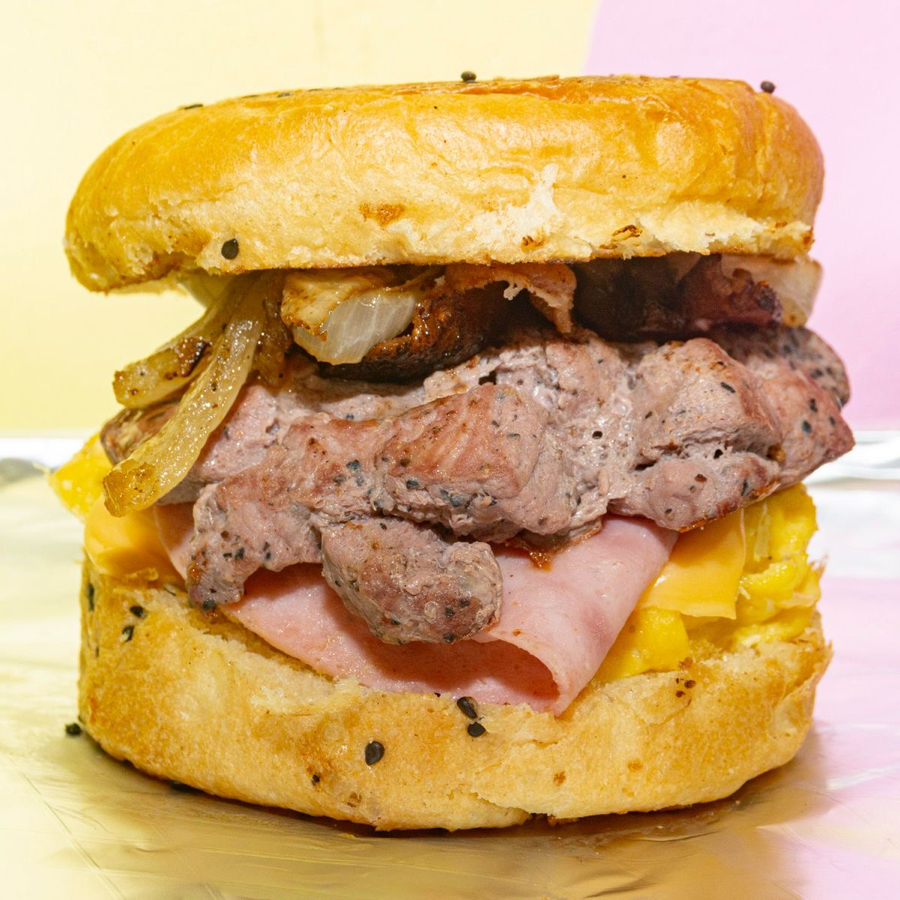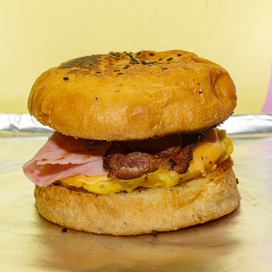 Pan brioche, pork sausage, huevo esponjoso, jamón, tocino y queso derretido