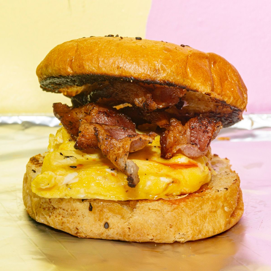 Pan brioche, huevo esponjoso, tocino y maple spicy