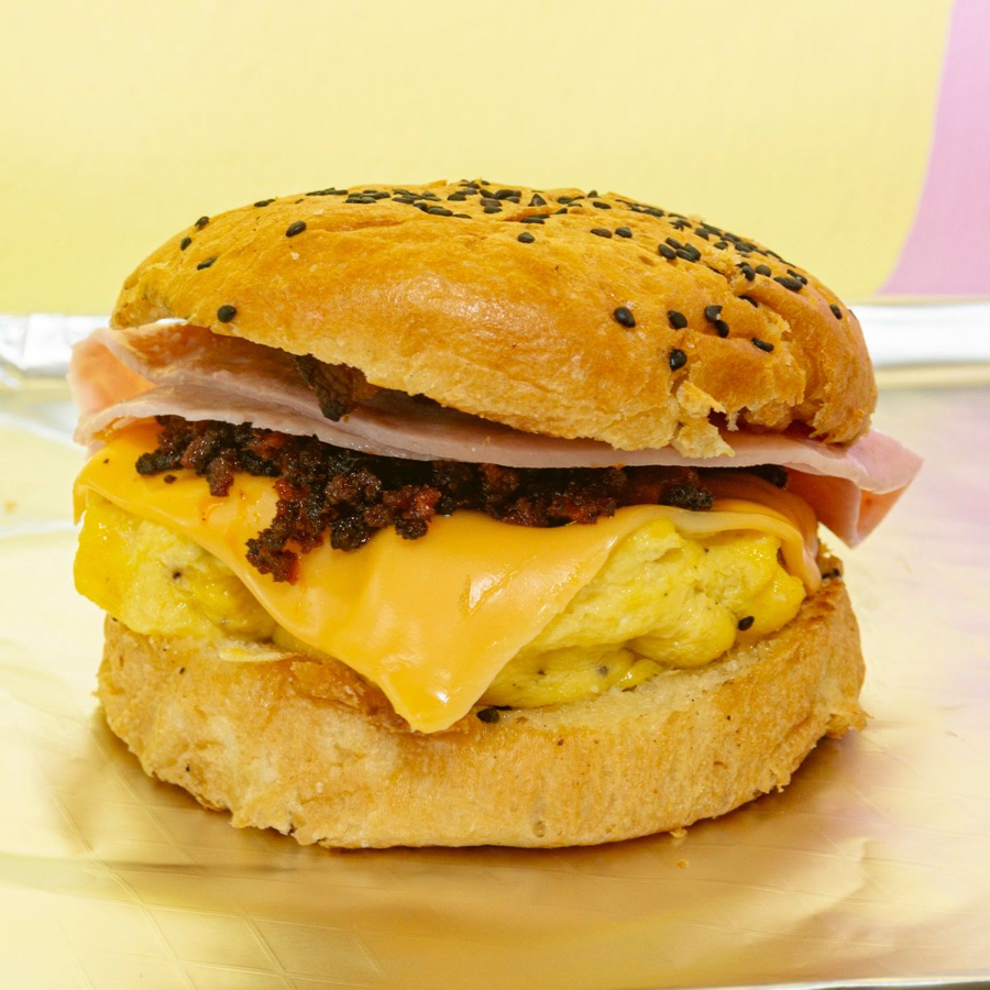 Pan brioche, chori, huevo esponjoso, jamón, tocino y queso derretido