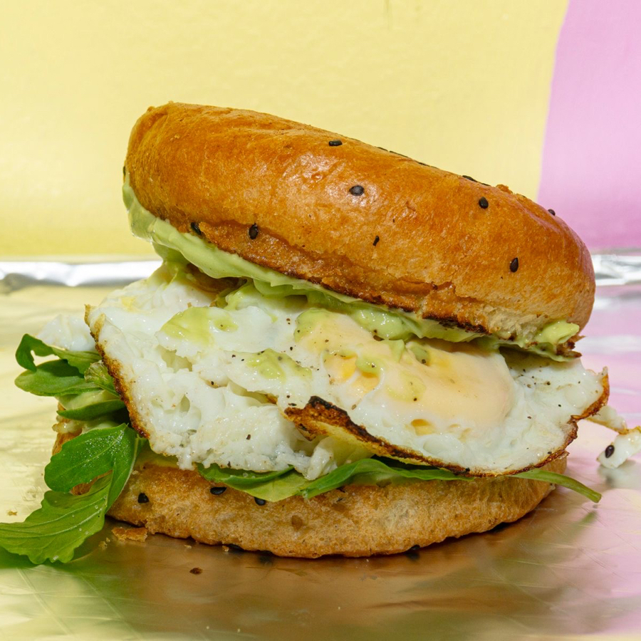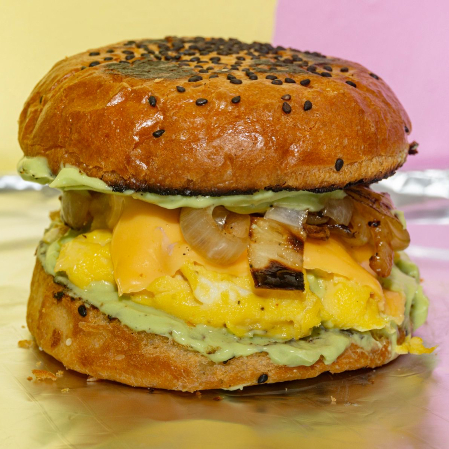 Pan brioche, huevo esponjoso, queso derretido, cebollitas caramelizadas y guacamole
