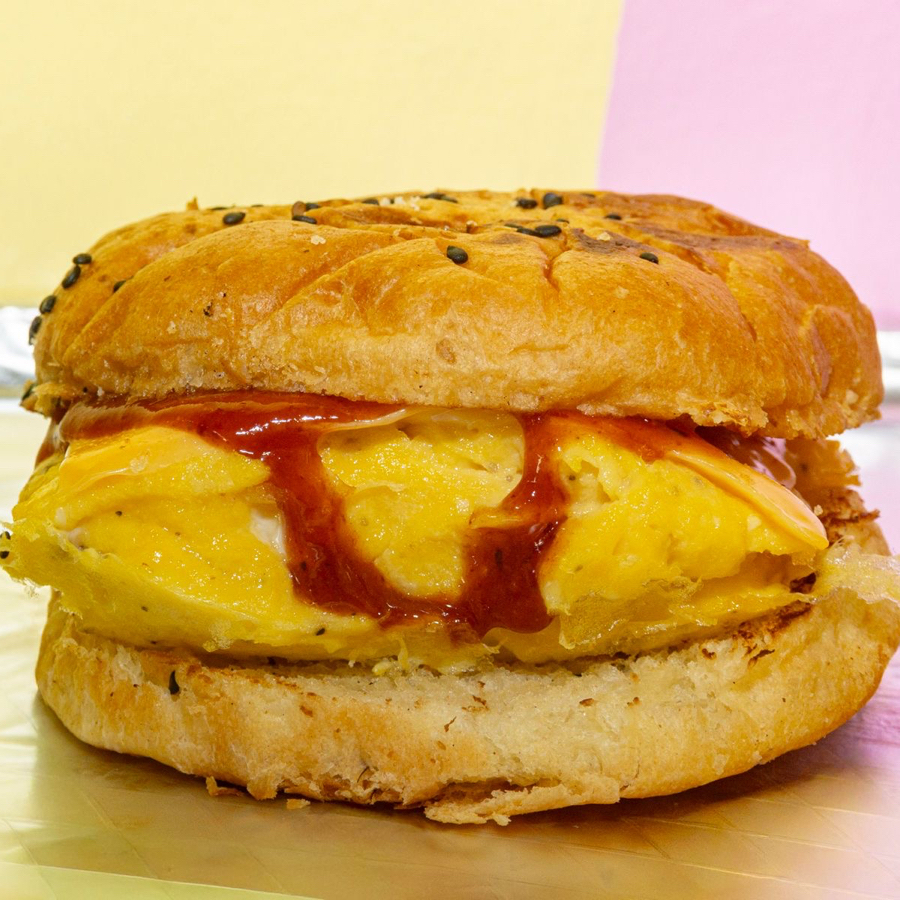 Pan brioche, huevo esponjoso, queso derretido y catsup spicy