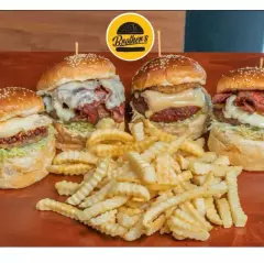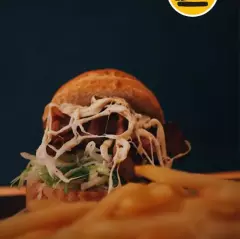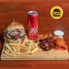 Carne de res bañada en salsa BBQ, lechuga, aderezo de la casa, queso amarillo, tocino y deliciosos aros de cebolla, incluye papas individuales.