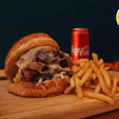 Carne de res acompañada de lechuga, aderezo de la casa, extra tocino y queso gouda gratinado.
