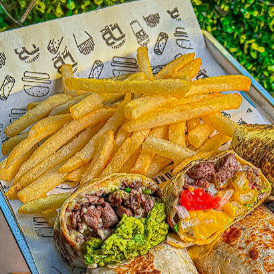 Tortilla de harina XXL relleno con Mezcla de Quesos, chipotle, carne en rodajas, arroz rojo, frijol charros, lechuga, aguacate, elige algún extra...
