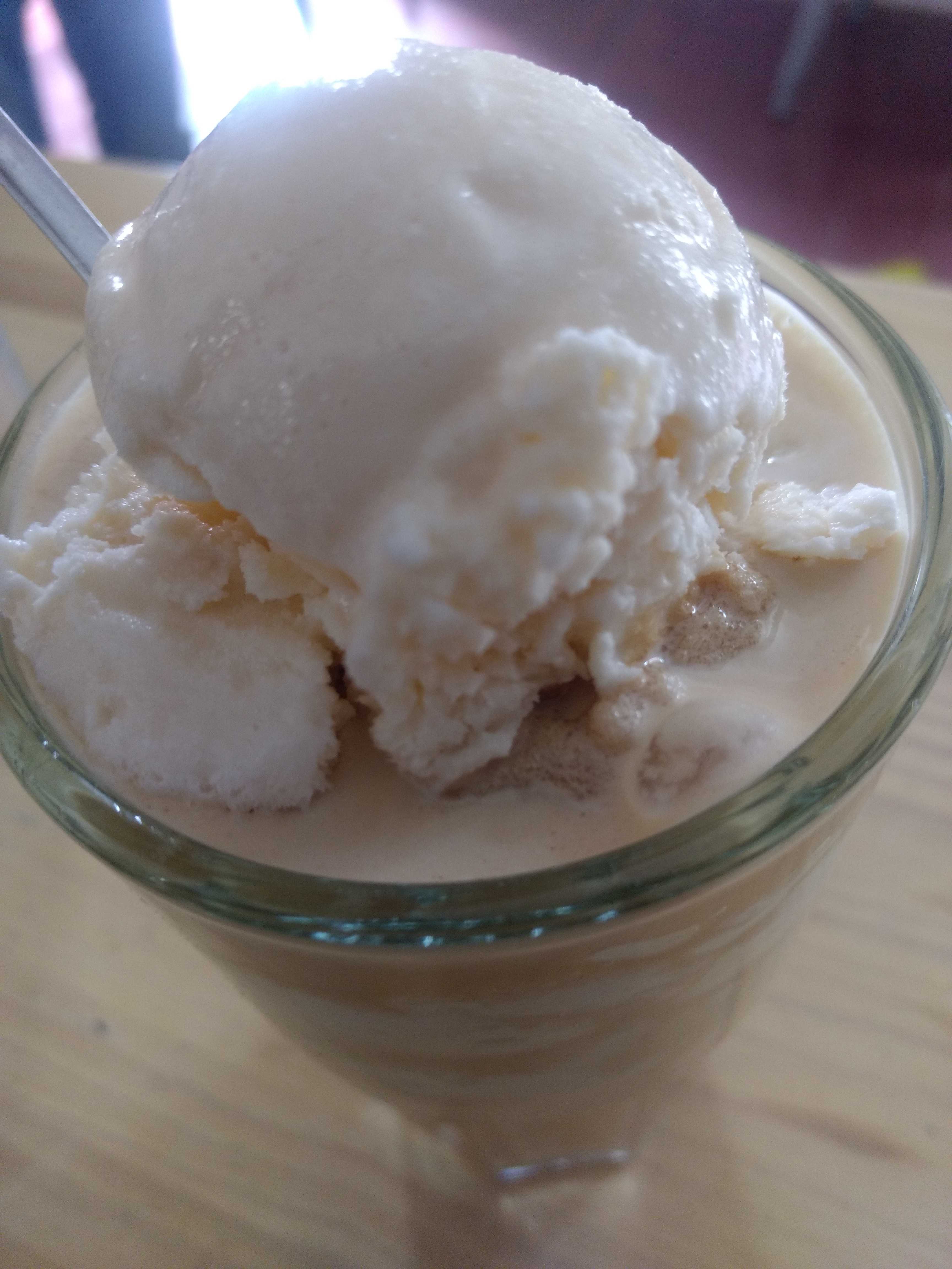 Leche, espresso, hielos, polvo de arroz y un toque de nuez.