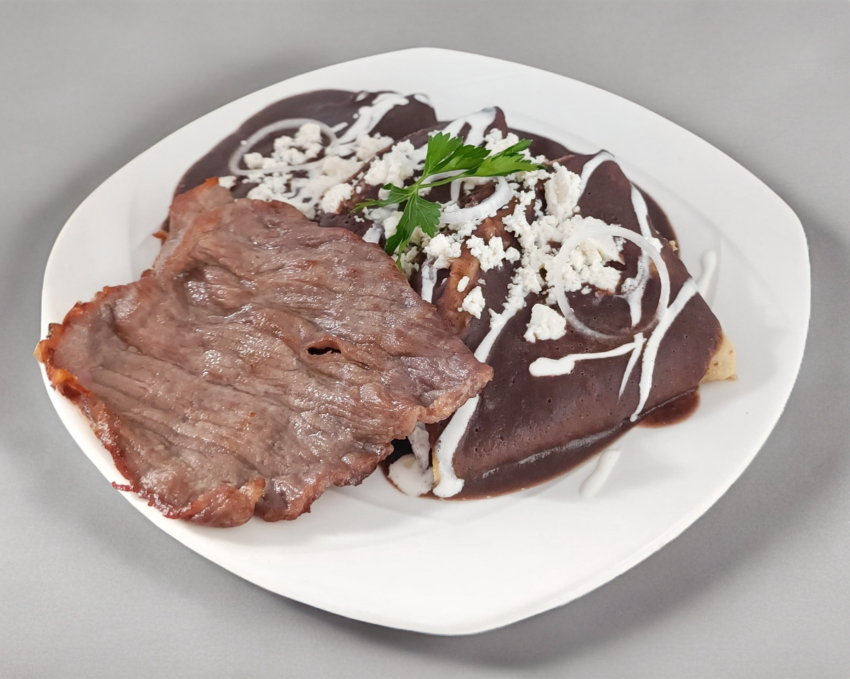 Totopo de tortilla de maíz en salsa de guajillo, decorado con perejil, queso, crema; acompañado de proteína a elección: (pollo deshebrado, chorizo, tasajo, cecina) más 3 rebanadas de pan.