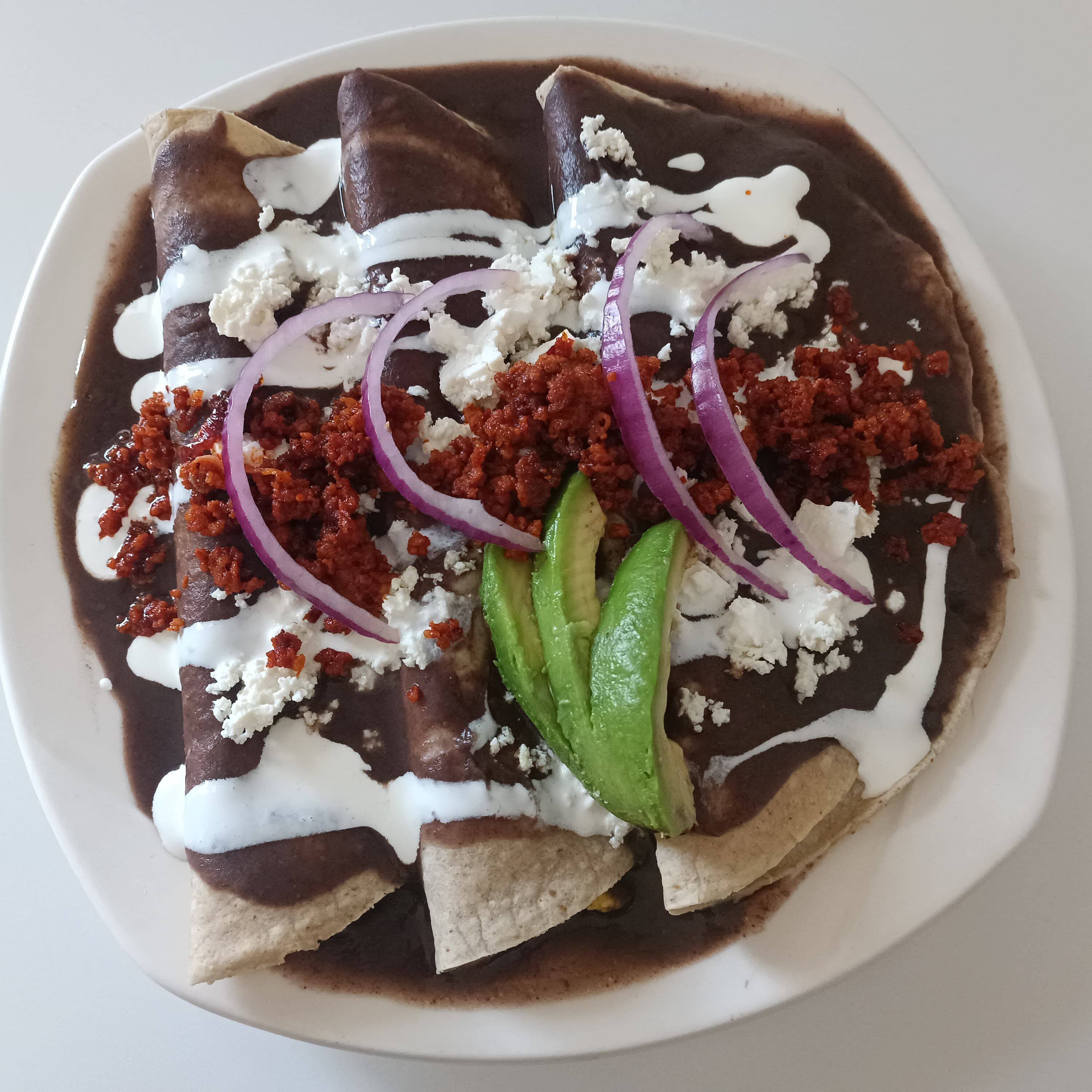 3 Piezas de tortilla de maíz rellena de huevo revuelto, bañado en pasta de frijol molido, decorado con cebolla morada, queso, crema, chorizo y aguacate.
