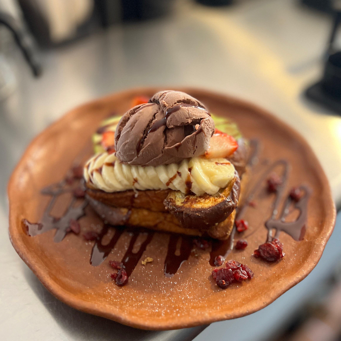 Pan brioche, base maple o chocolate acompañado de fresa, plátano, manzana , arándanos y helado