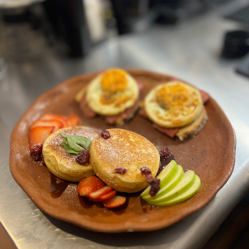 4 piezas de hot cakes, base maple o chocolate, acompañado de fresa, platano manzana y arandanos