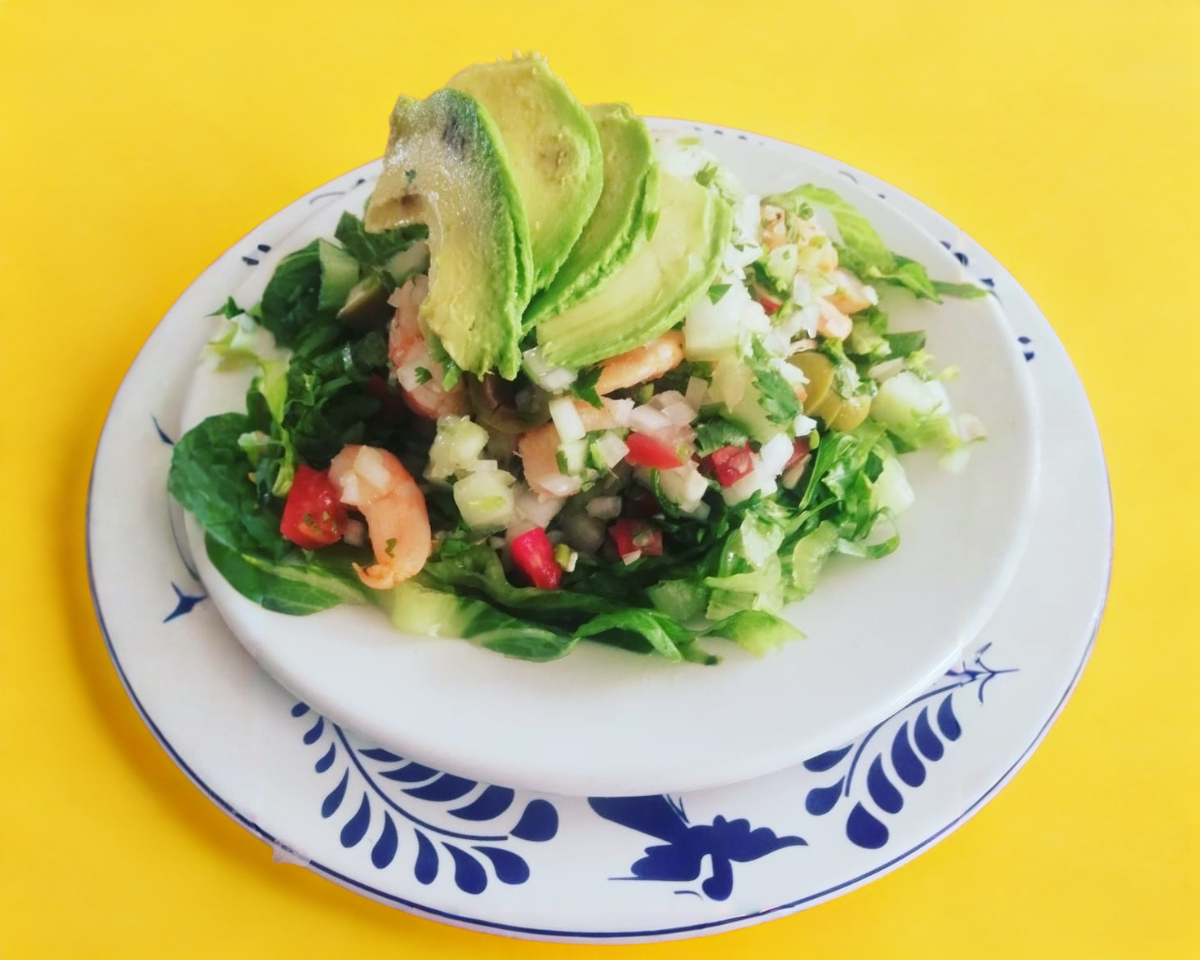 Ensalada hecha con camarón cocido, tomate, cebolla picada, pepino, cilantro, aceituna y aguacate con un aderezo de aceite de olivo.