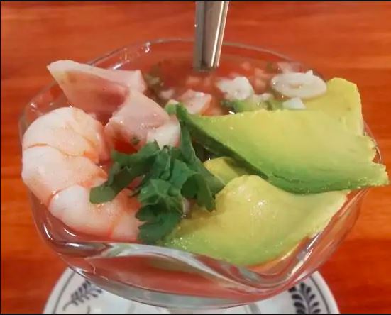 Coctel de camarón y ceviche, con salsa de la casa roja o marinera blanca.