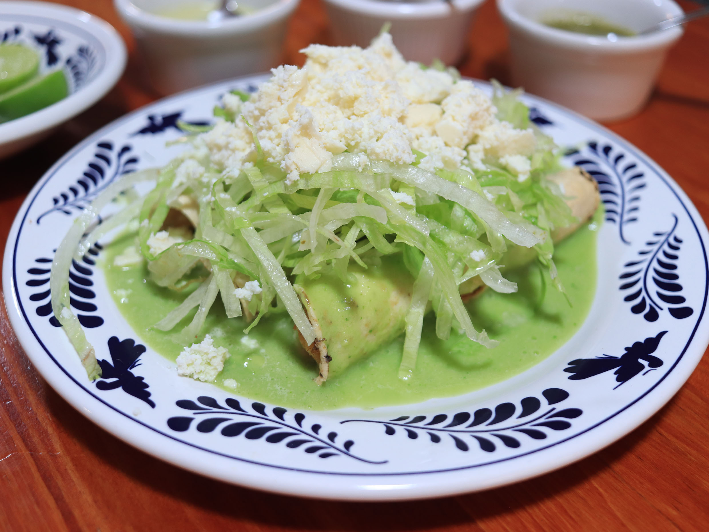 3 Tacos dorados de pollo, preparados al momento, acompañados de guacamole, lechuga y queso.