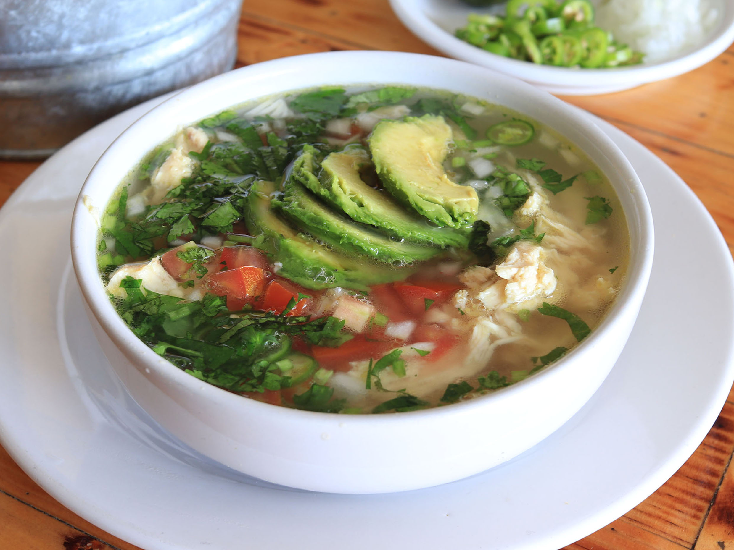 El caldo de pollo, con un toque picosito, un caldito mas espeso e igual de rico como el clásico.