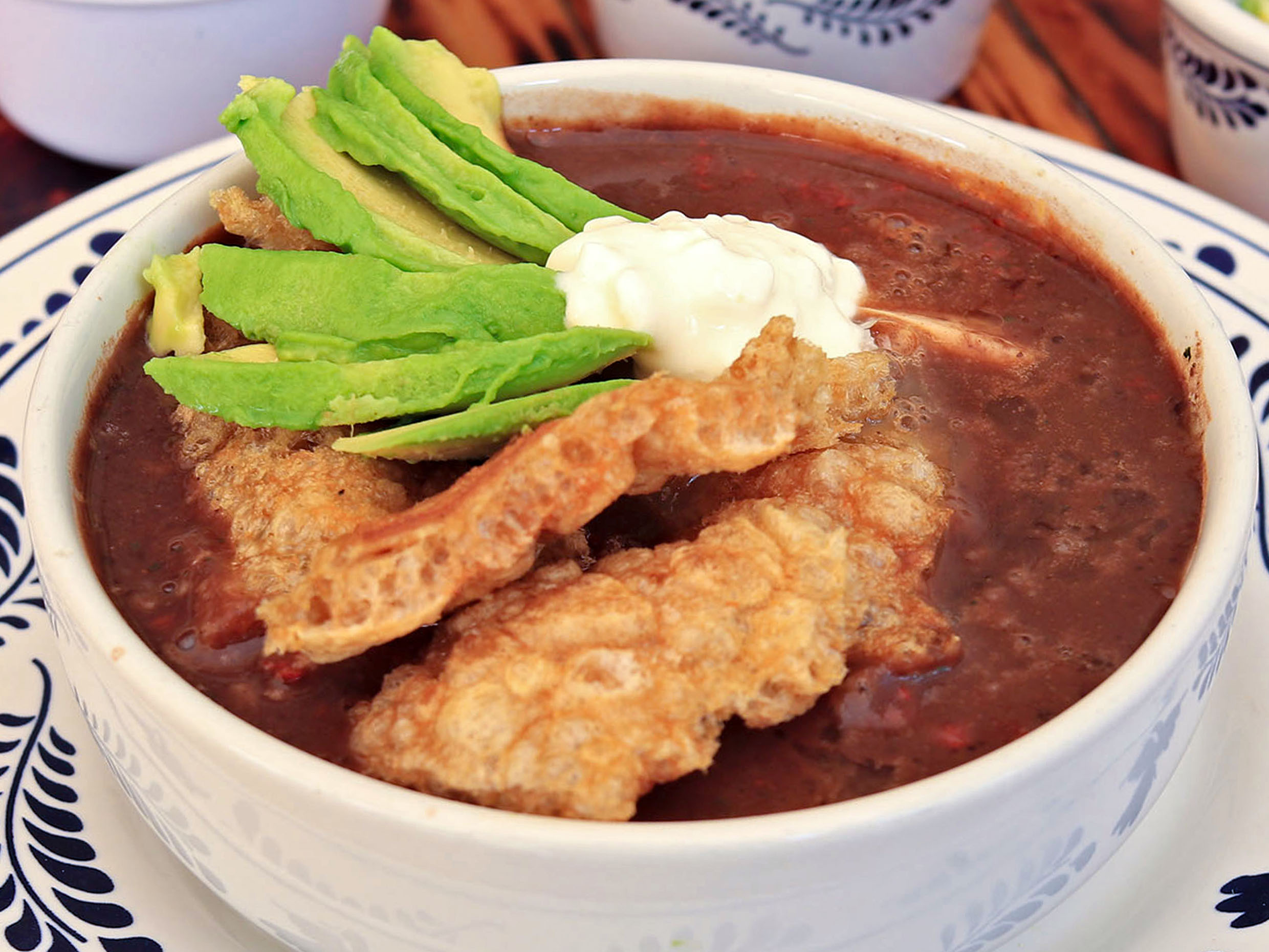 Caldito hecho para estómagos de piedra, rico frijol molido con sus hierbas, acompañada de chicharrón, carne de puerco, chorizo, queso, crema y aguacate.
