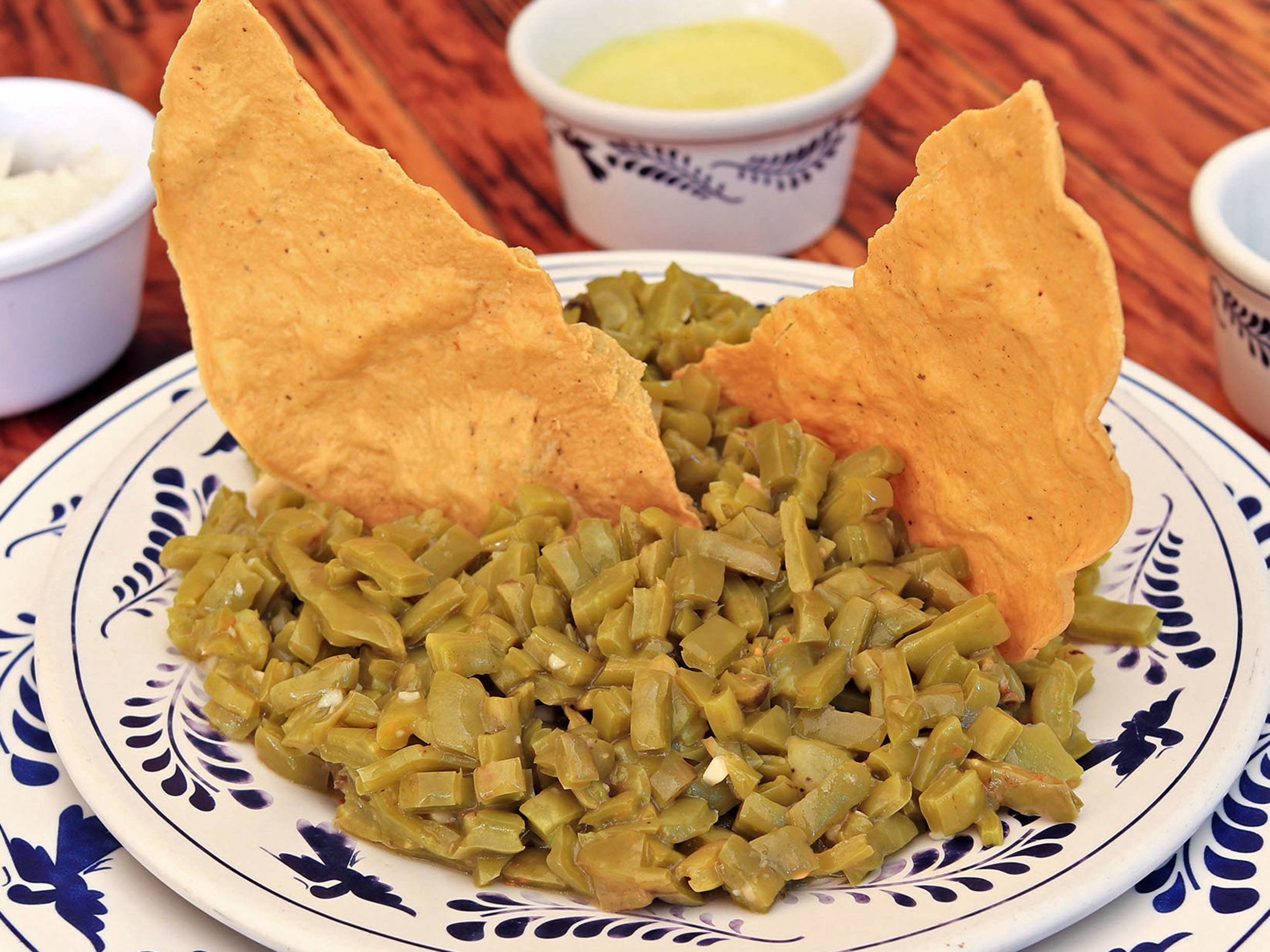 Nopales sancochados con aceite de oliva y ajo y sazonados con sal de gusanito.