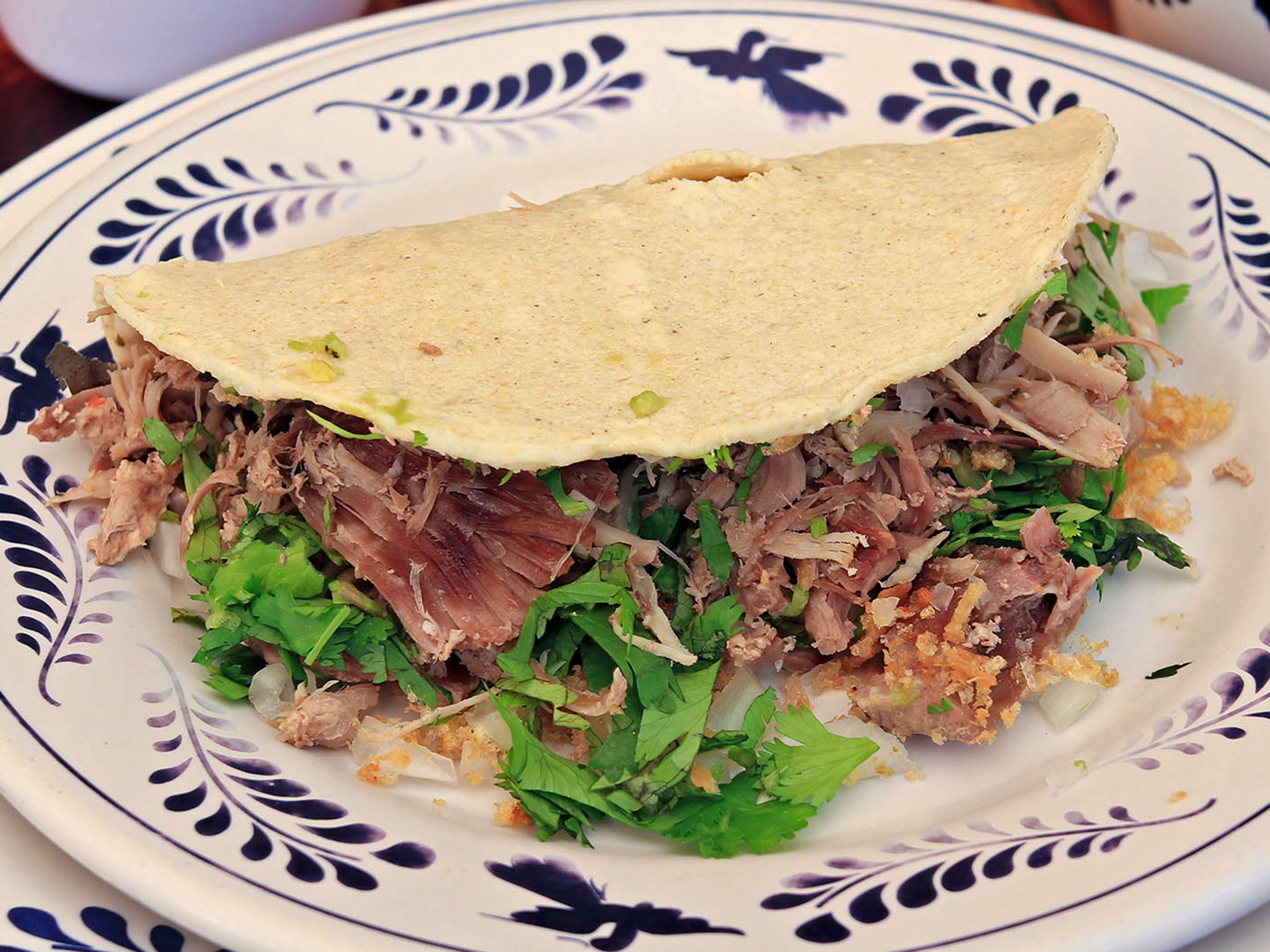 Taco de pierna de pierna de puerco acompañado de cilantro, cebolla, aguacate y chicharrón picado.