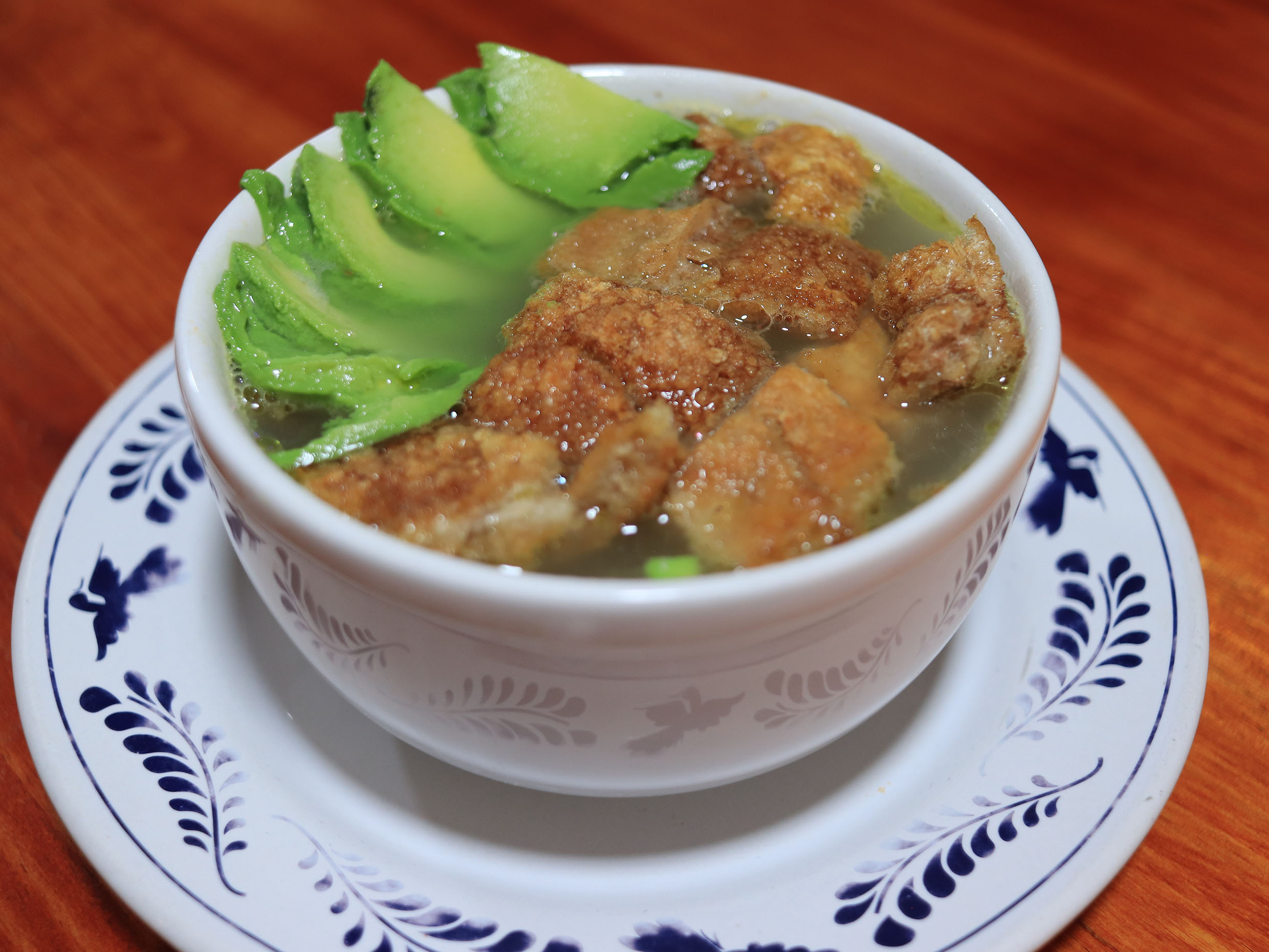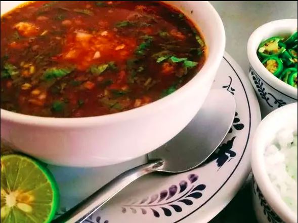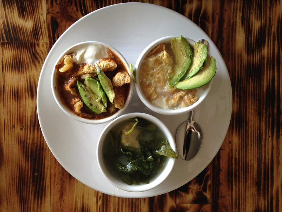 El caldo de la casa, que se acompaña con queso, crema, chicharrón, aguacate y carne o nopal.