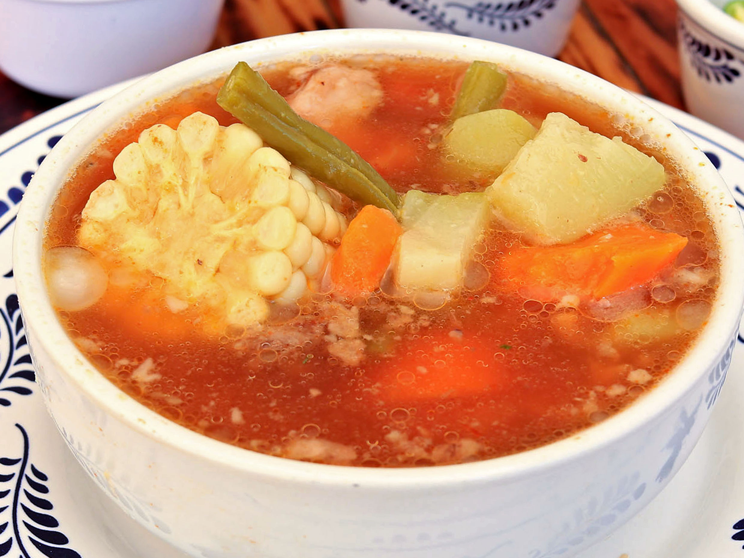 El mejor caldo de pollo, mezclado con sus verduras cocidas como elote, ejote, chayote, zanahoria, papa y un toque de cilantro.