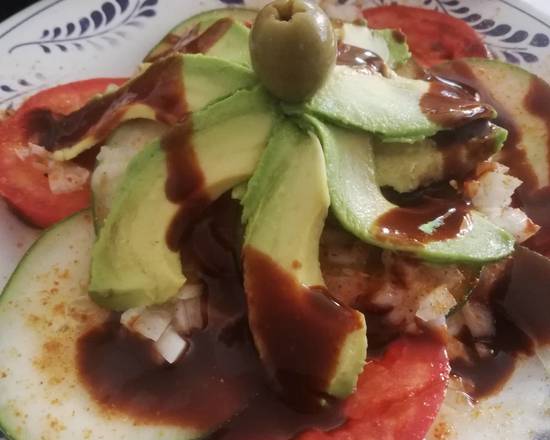 Ensalada hecha con camarón cocido, tomate, cebolla picada, pepino, cilantro, aceituna y aguacate con un aderezo de aceite de olivo.