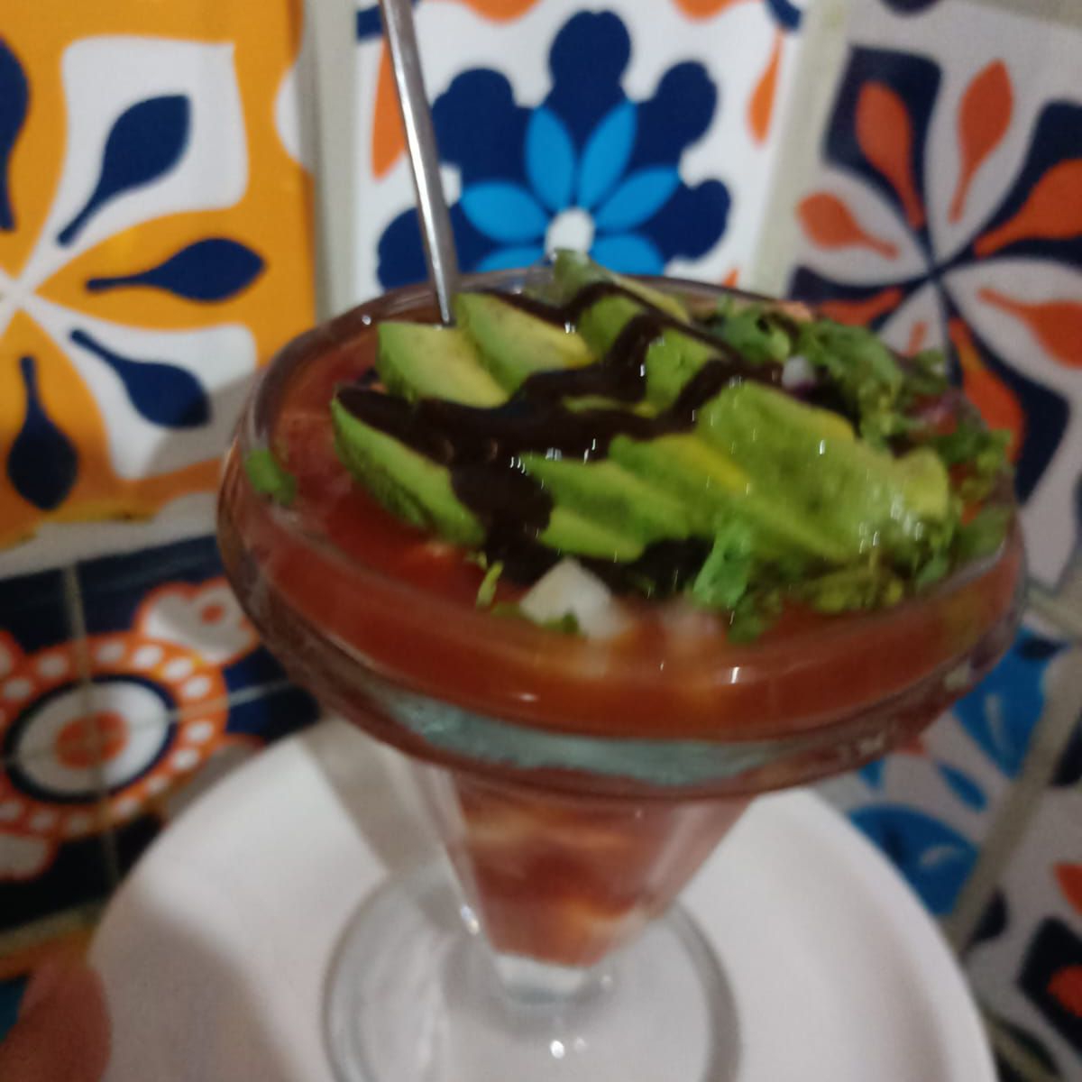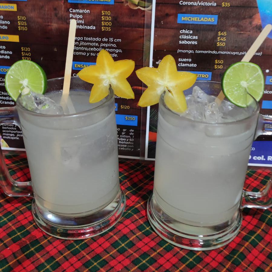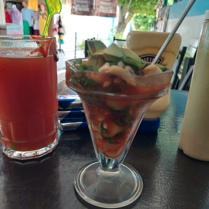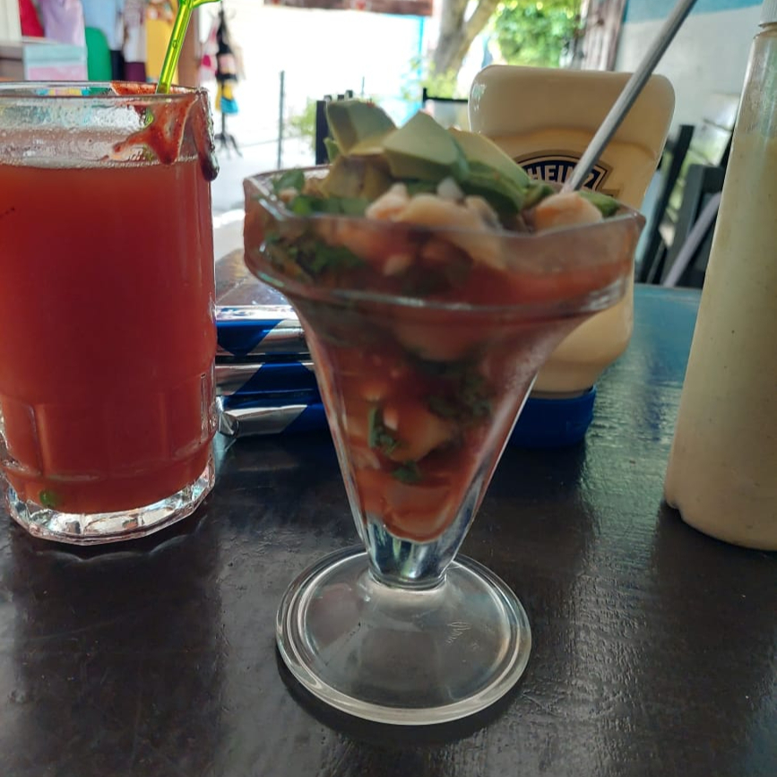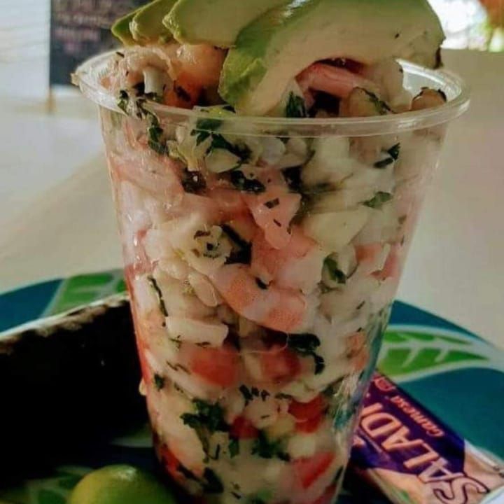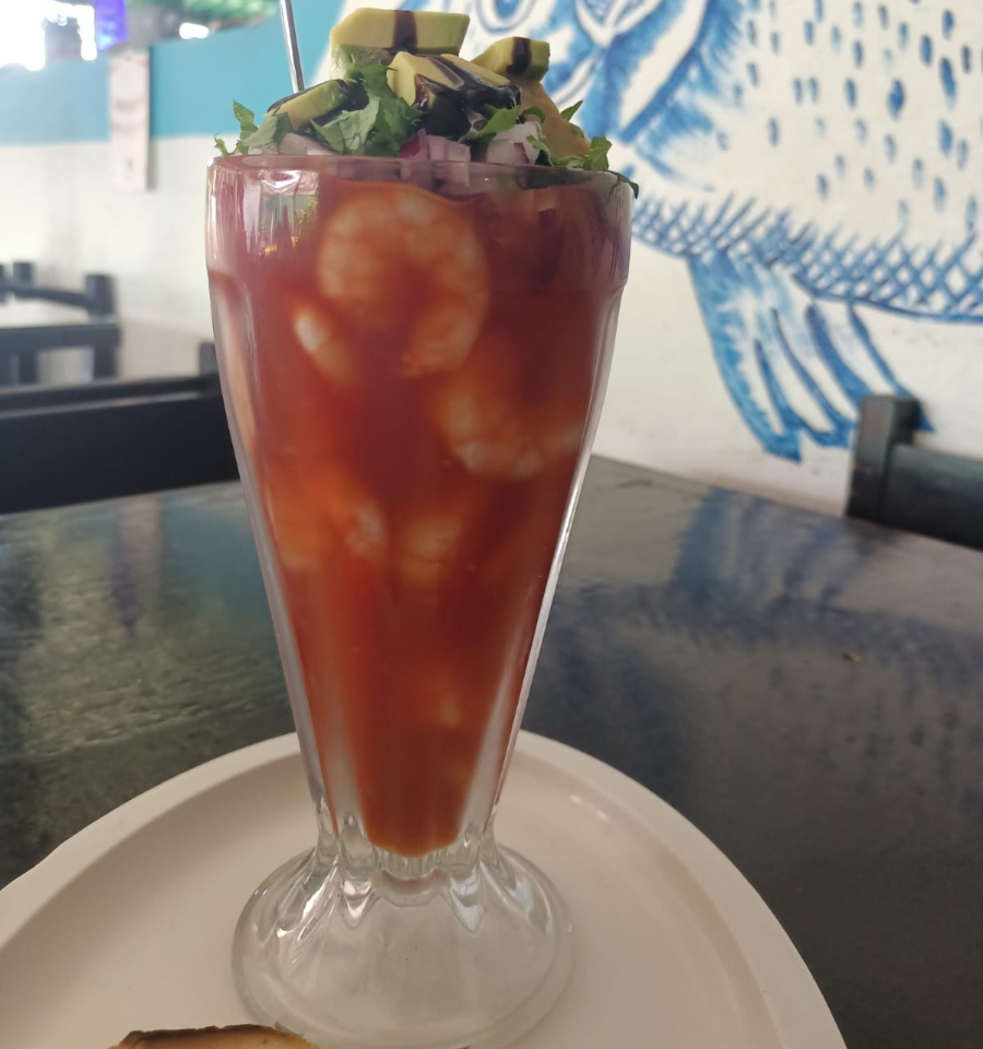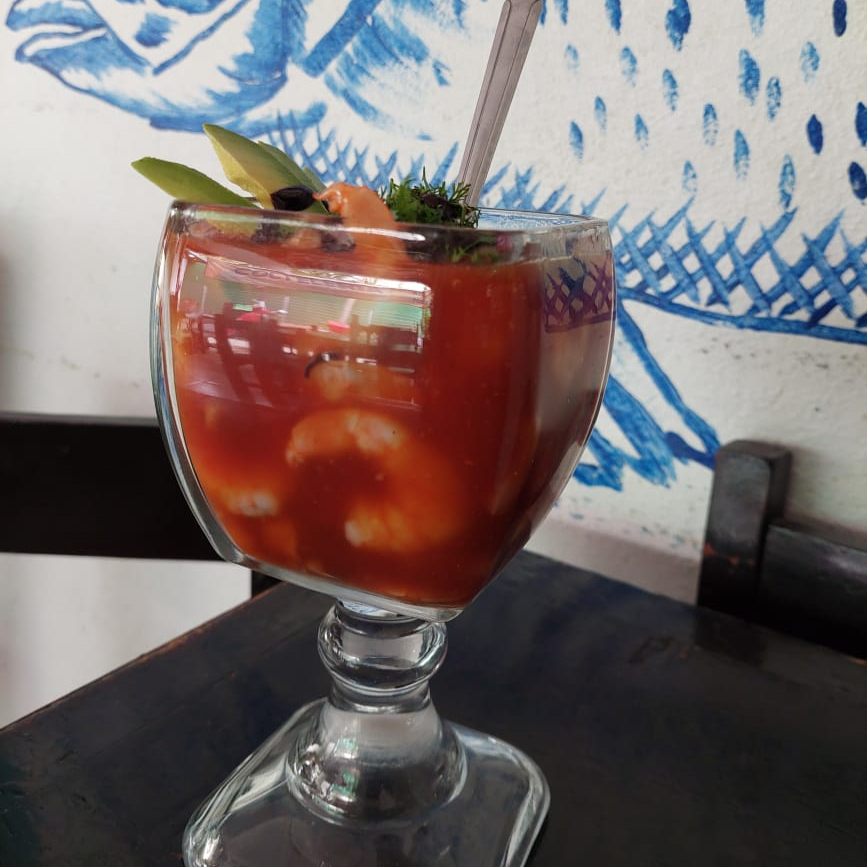 Ccamarones curtidos, camarones cocteleros, pulpo, pescado, ostion y surimi mezclado con una salsa de clamato de la casa, cebolla, pepino y aguacate.