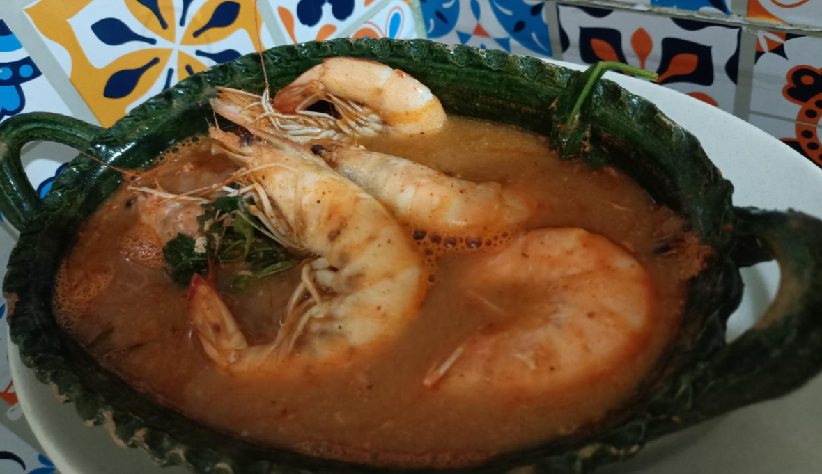 Manjar de camarones en caldo de la casa de chile guajillo y jitomate