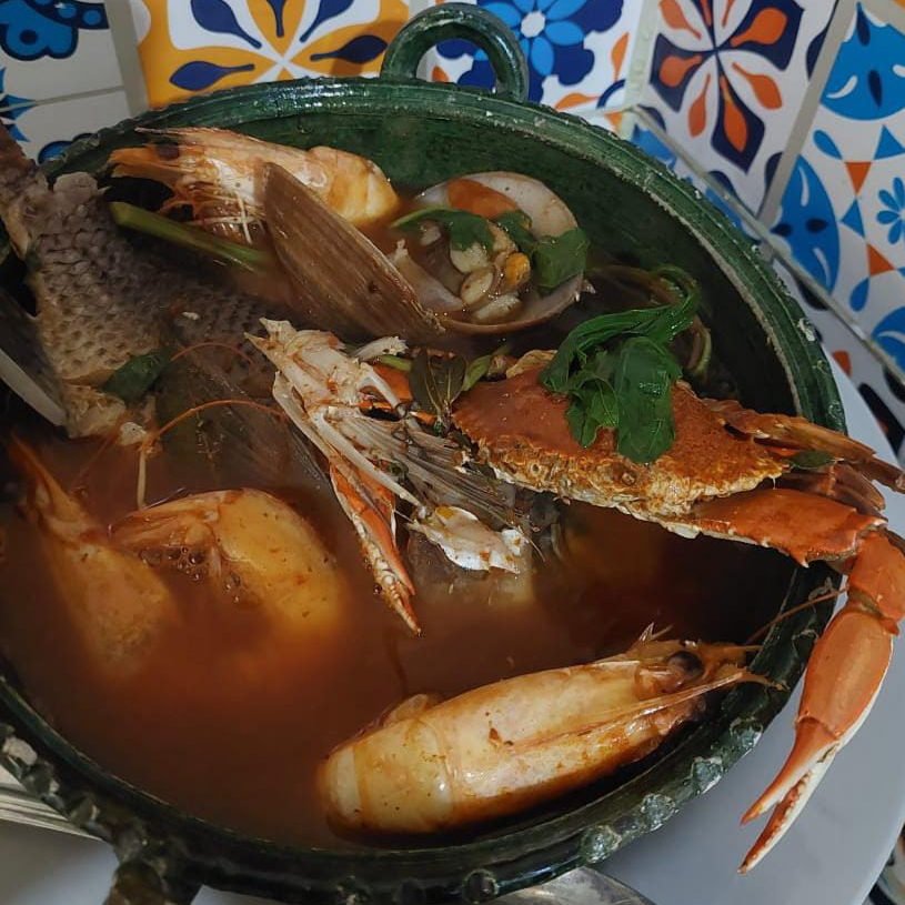 Exquisito Caldo 7 Mares (camarón, jaiba, pescado, surimi, almeja, pulpo y caracol) a base de chile guajillo acompañado de cilantro, cebolla y chile con tostadas