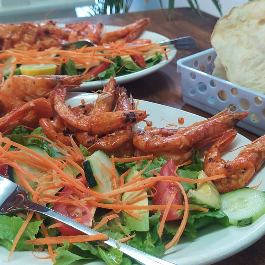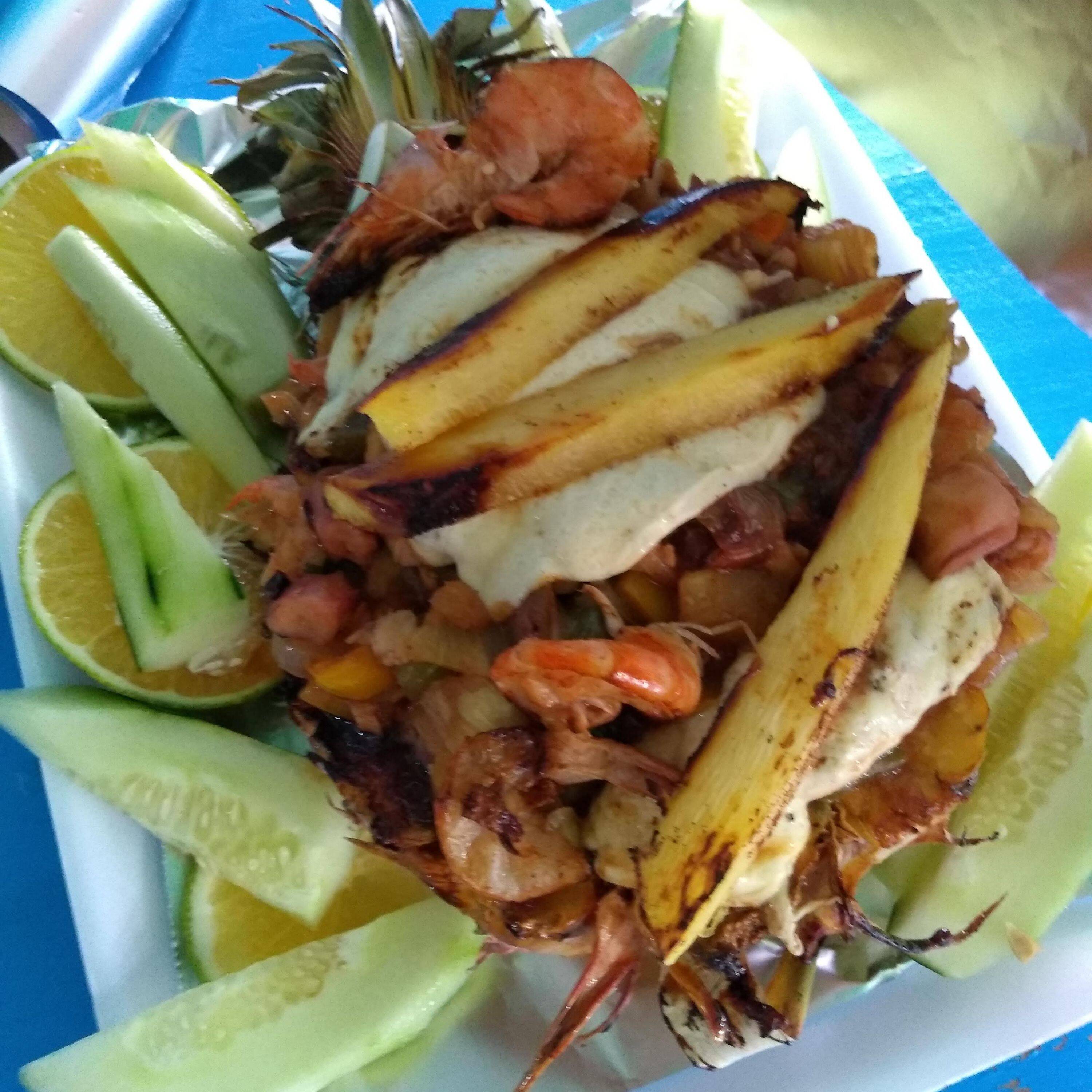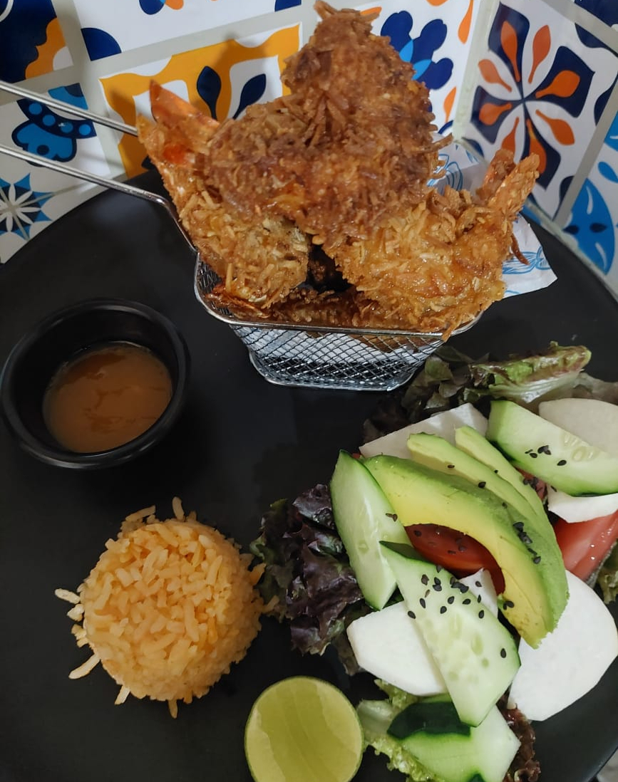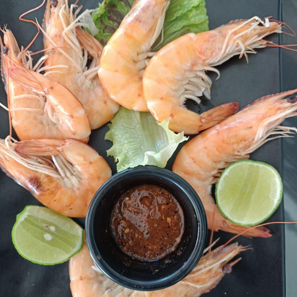 Camarones frescos, bañados de una rica salsa de capsu preparada con especias de la casa, cilantro, cebolla, aguacate con un toque de aceite de oliva y salsa negra.y