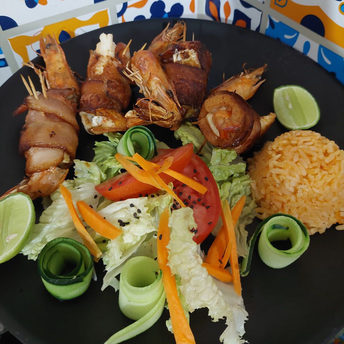 Camarones rellenos de quesillo envueltos en tocino, con 2 guarniciones