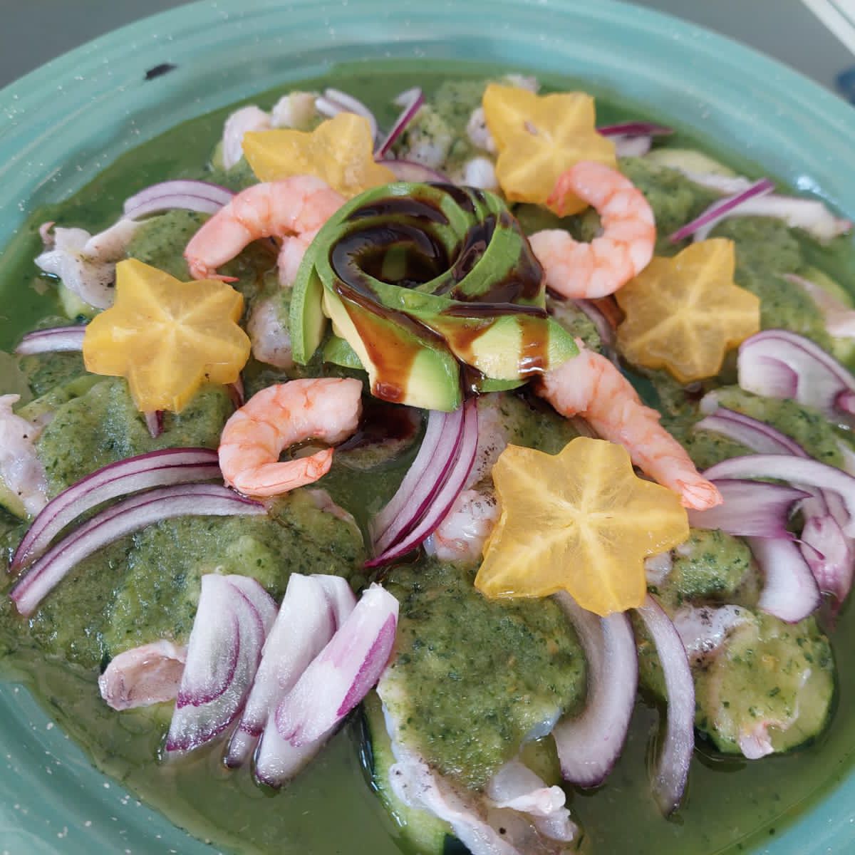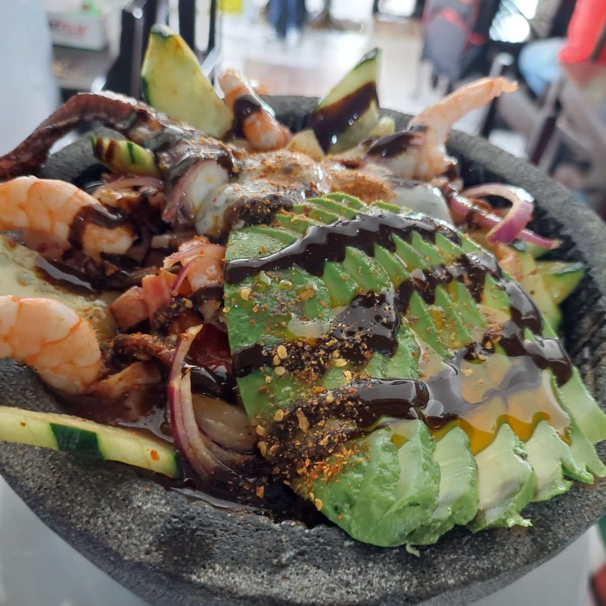 Camarones y pulpo bañados de un jugo de capsu de la casa con cebolla, cilantro, aguacate y un toque de salsa negra y aceite de oliva