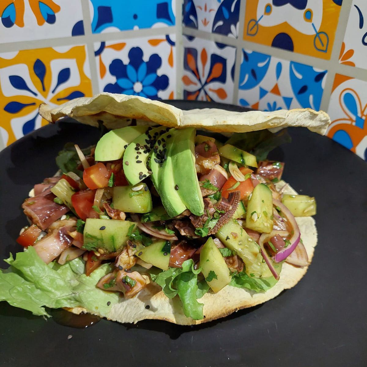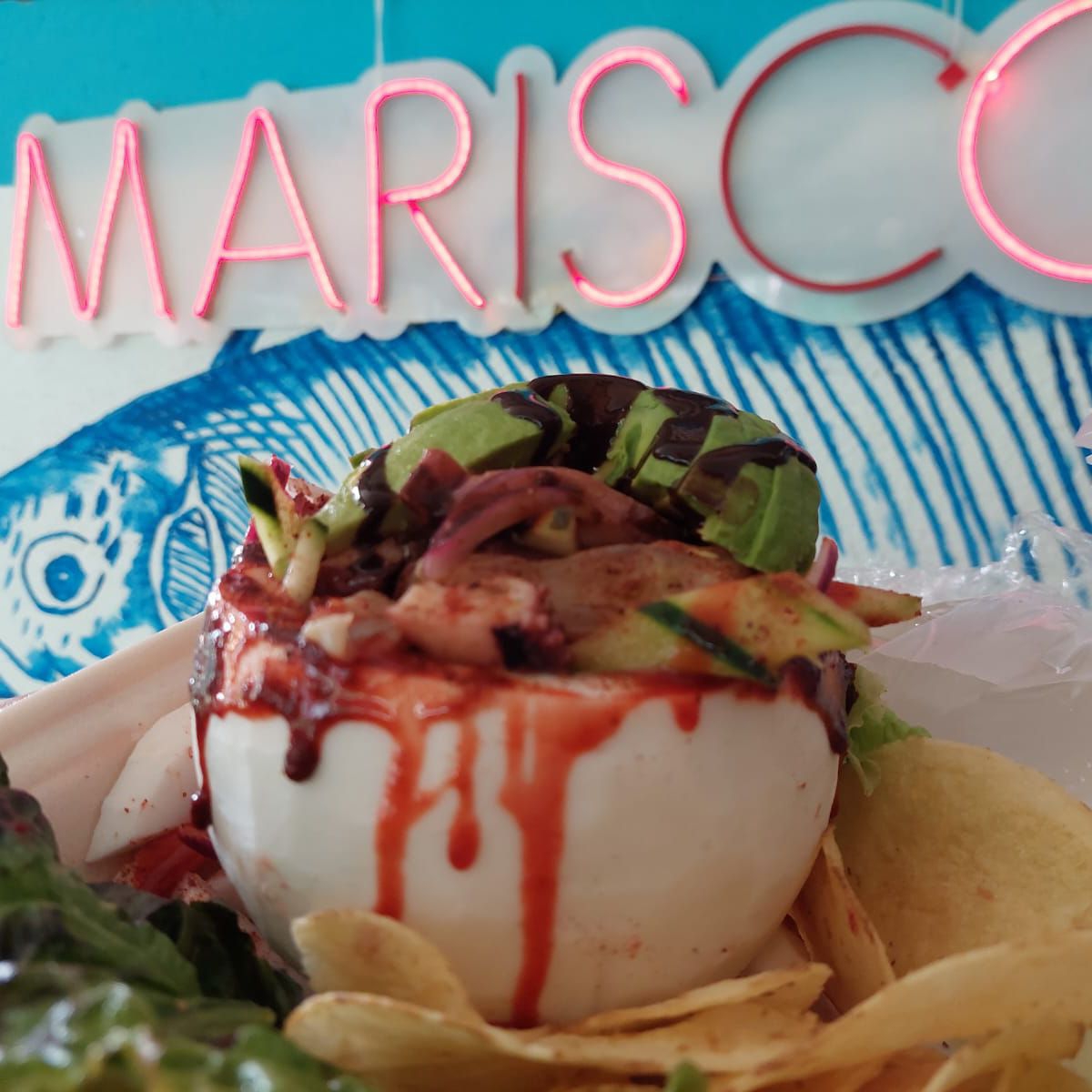 (tortilla de maíz, una cama de guacamole y su pulpo)