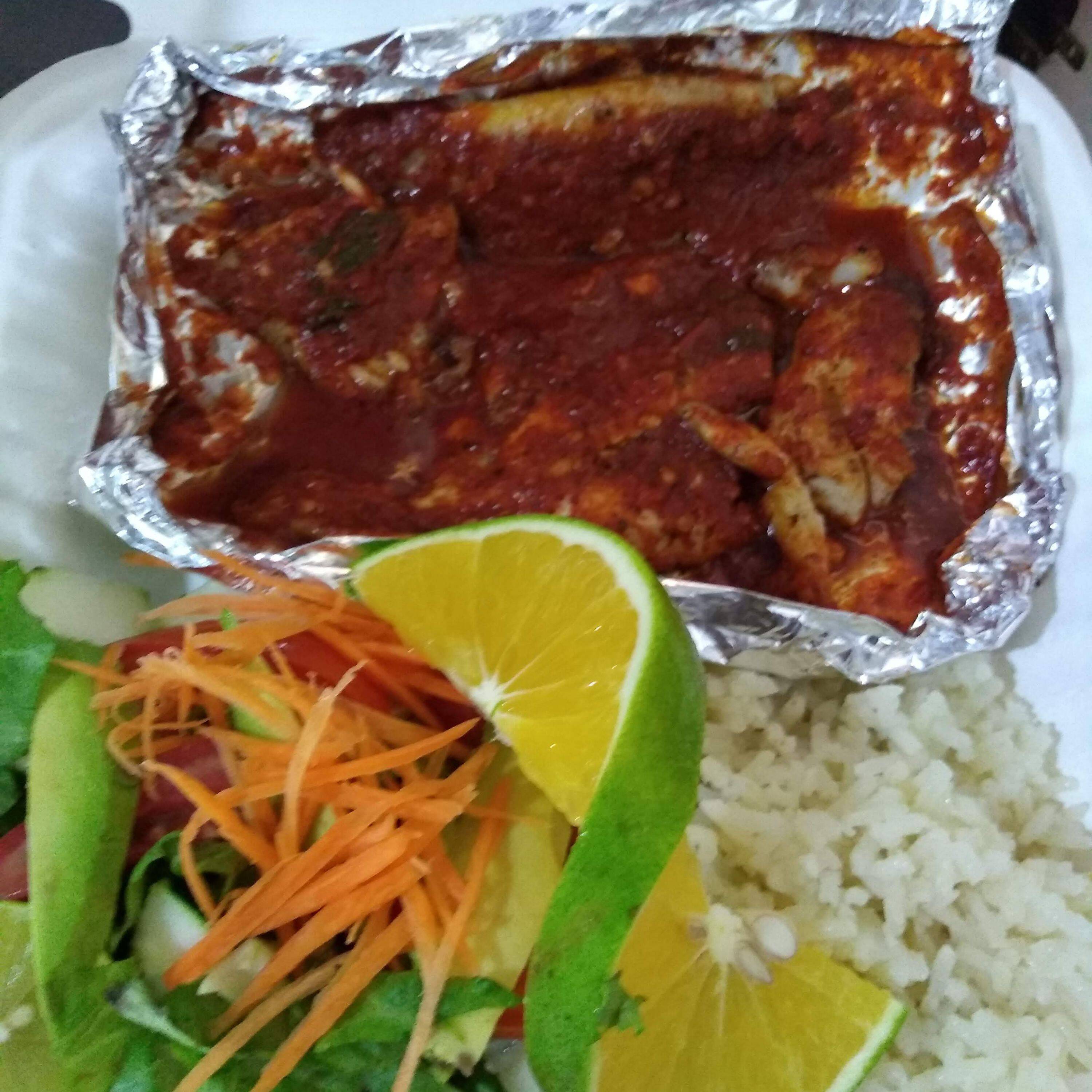 Filete de pescado bañado en una salsa de habanero se 2 guarniciones