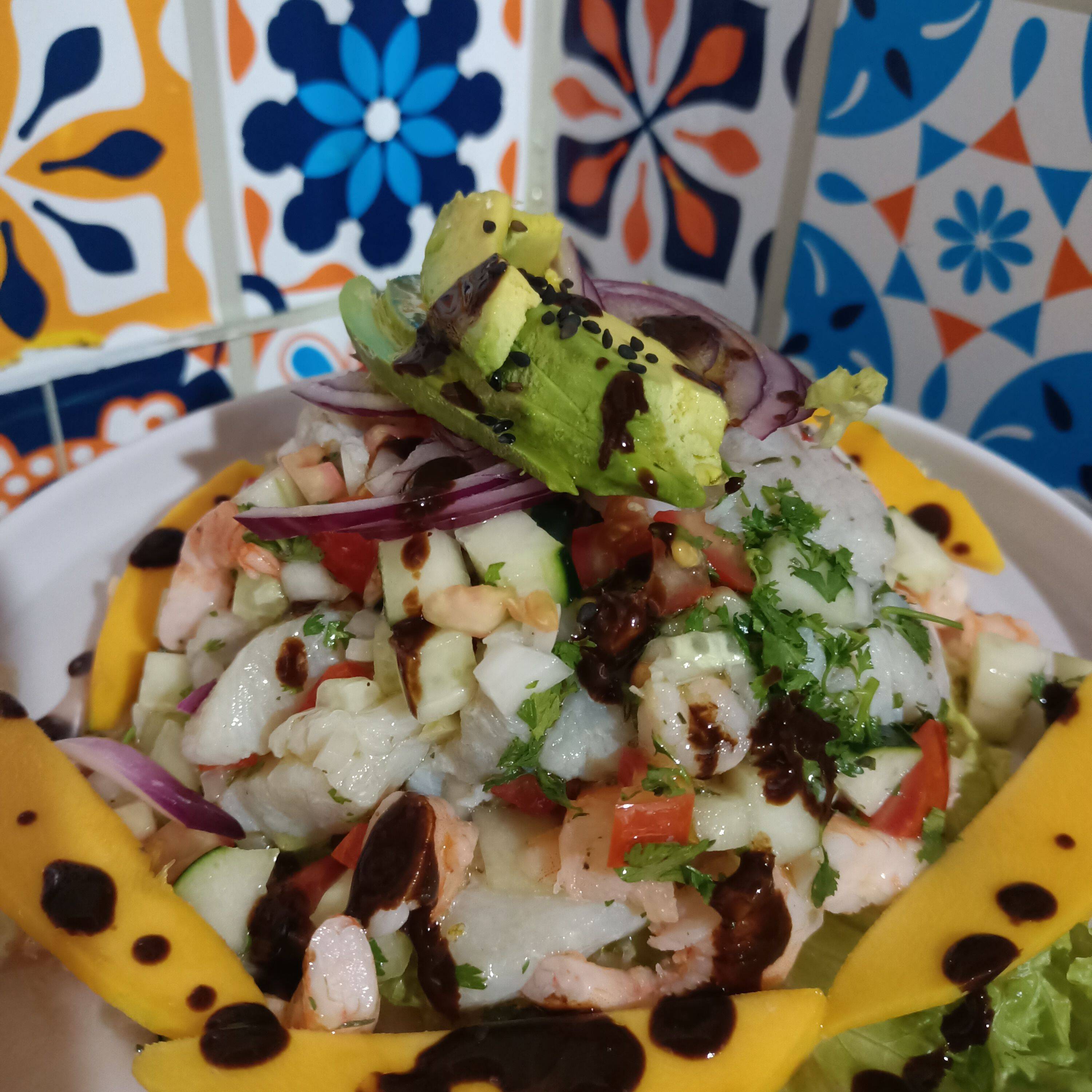 cubos de pescado curtido en jugo de limón y especias, junto con camarón cocido en trocitos, mezclado con jitomate, cebolla, cilantro y aceite de oliva, decorado con aguacate y salsa negra