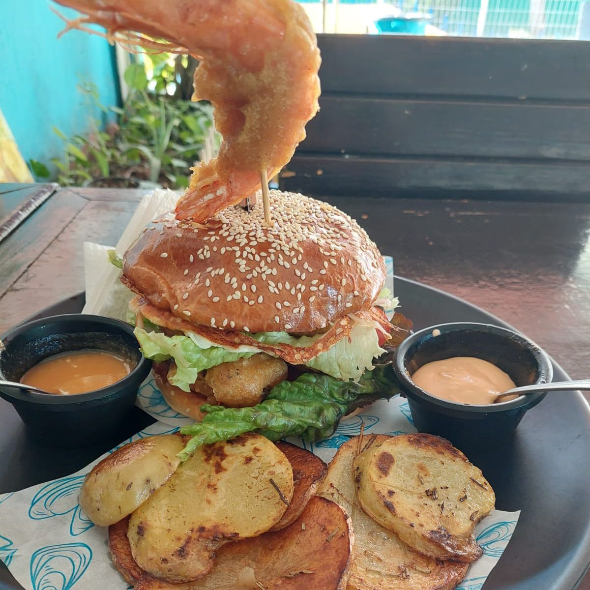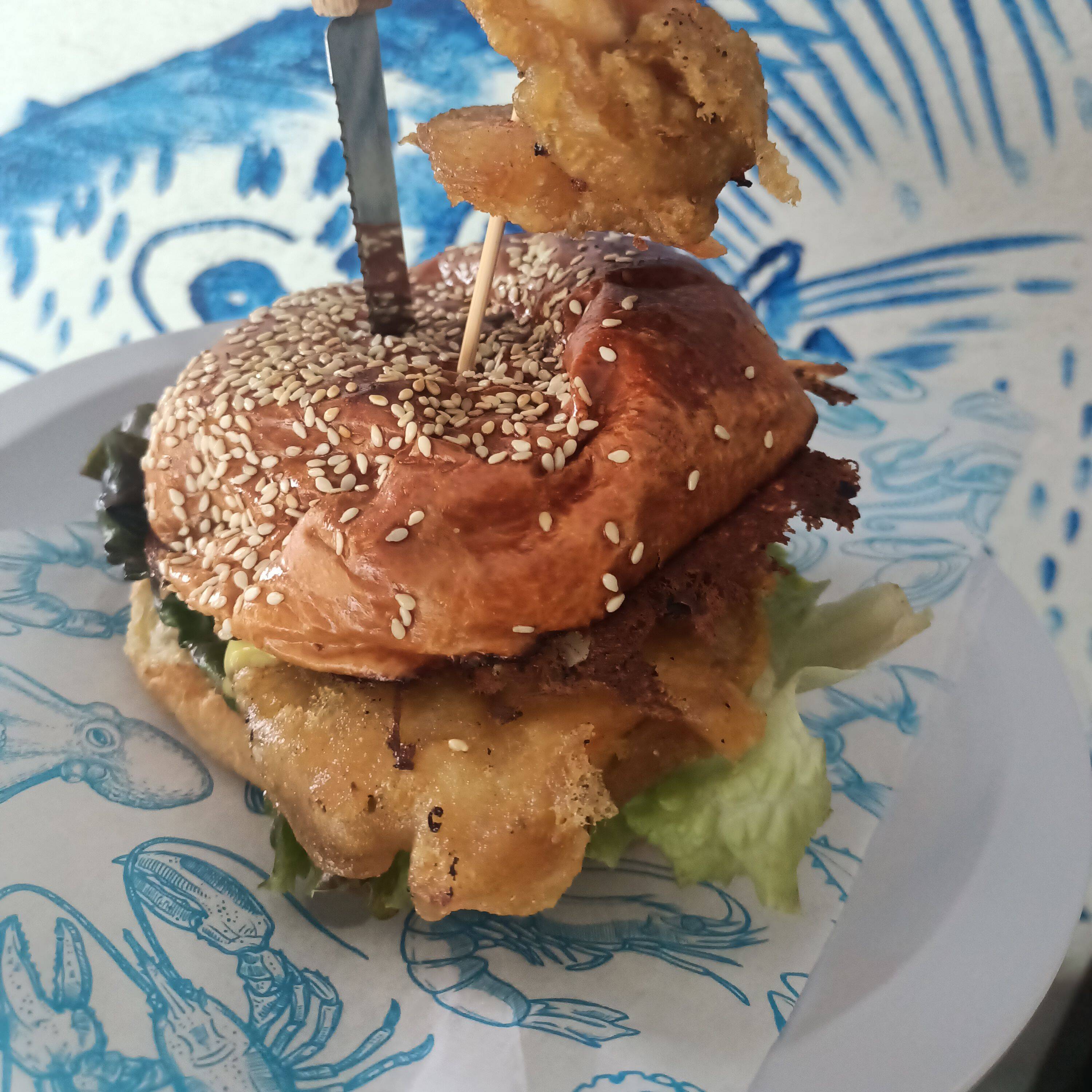HAMBURGUESA DE CAMARON Y PESCADO CON PAPAS